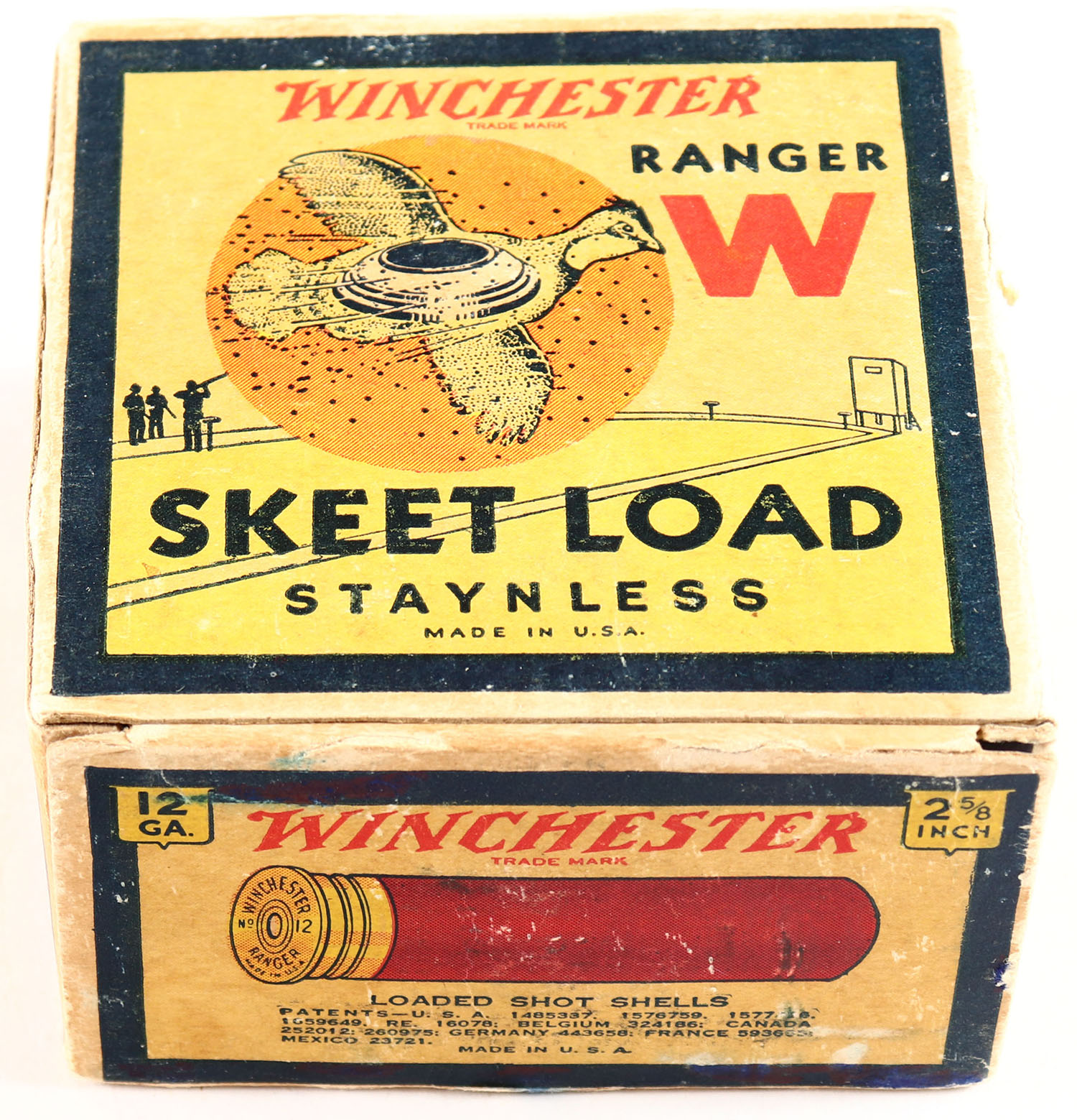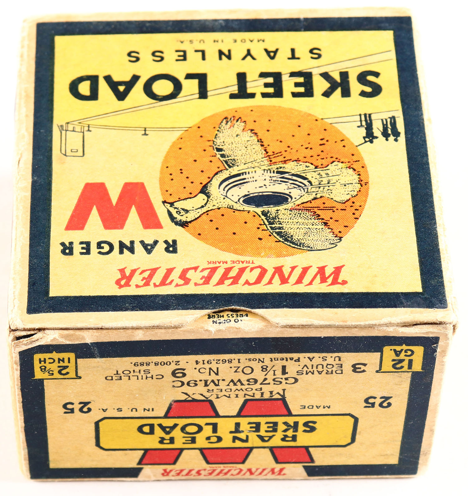 Winchester, RANGER SKEET LOAD, Minimax Powder, 12ga, 1pc., Full, White, blue & red box that pictures flying Quail with skeet in body & shot all around, Staynless, 2 5/8'', Loading: 3 Drams, 1 1/8 Oz. 9 Chilled Shot, Box is solid with excellent colors, RARE BOX Shells are very good. Grade: Excellent + - Value: 200 to 800