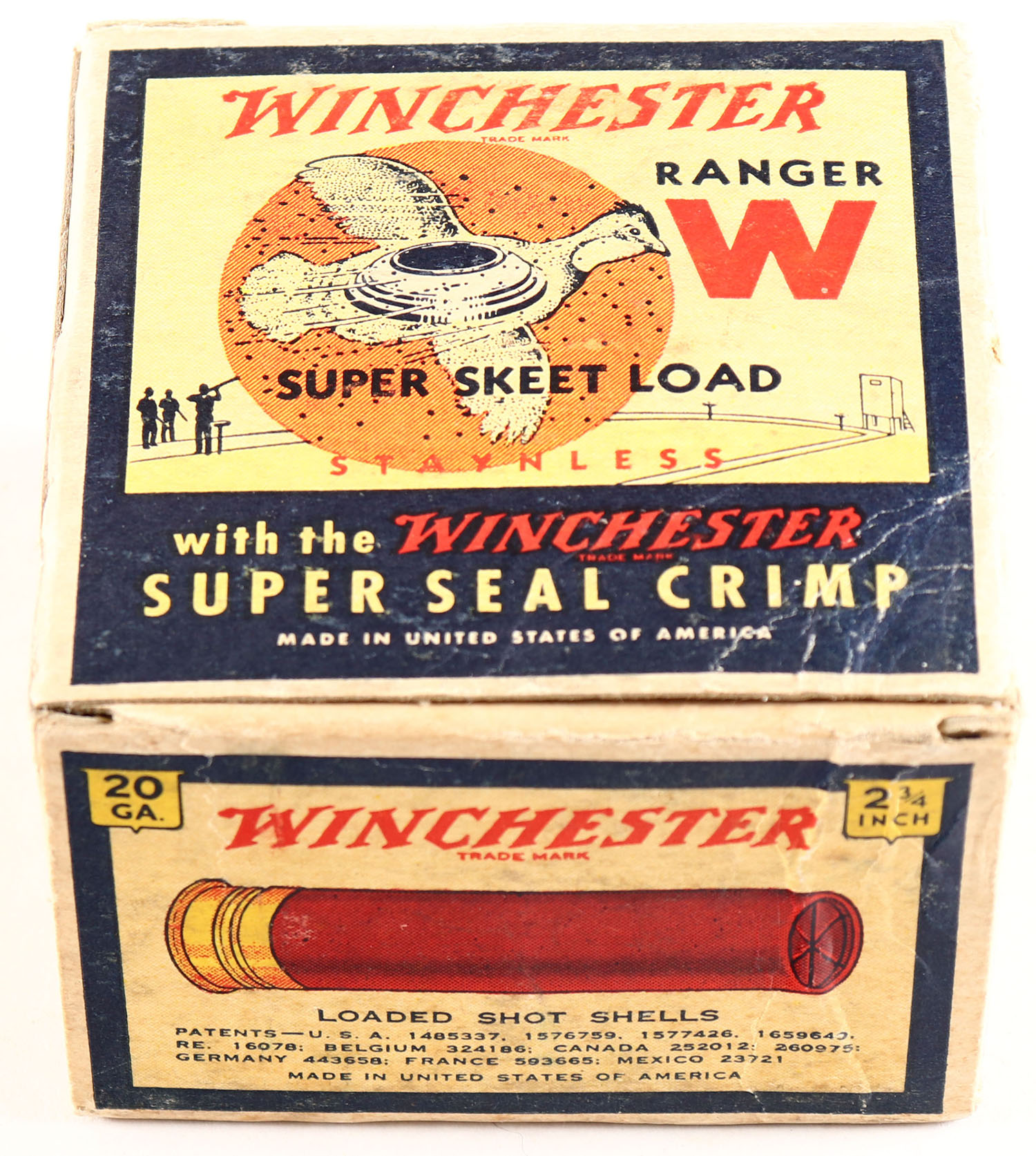 Winchester, RANGER SUPER SKEET LOAD, Hercules Red Dot, 20ga, 1pc., Full, White, blue & red box that pictures flying Quail with skeet in body & shot all around, Staynless, 2 3/4'', Loading: 2 1/4 Drams 7/8 Oz. 9 Shot, Box is solid with excellent colors, RARE BOX Shells are very good. Grade: Excellent ++ - Value: 100 to 300