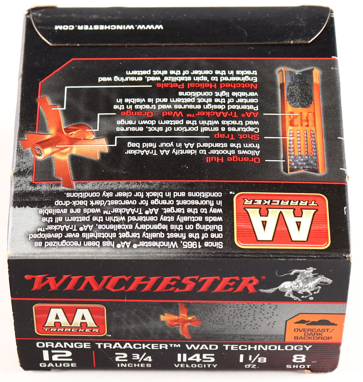 Winchester, AA, Tracker, 12ga., 2 3/4'', 1pc., Full, shot size 8, multi-colored box, box is very solid with great colors, shells are excellent. Grade: Excellent ++ - Value: 10 to 30