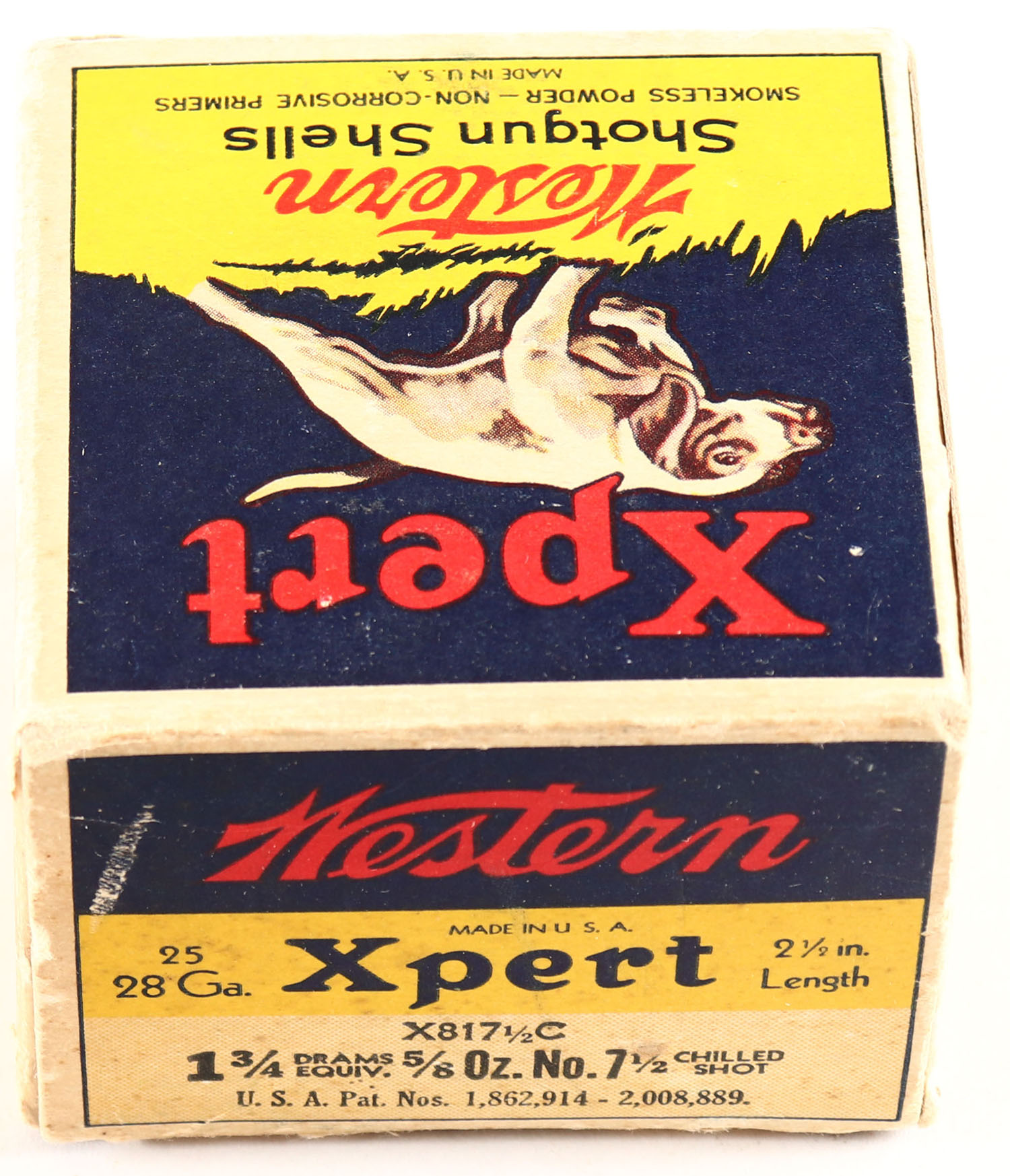 Western, Xpert, 28ga., 1pc., Full, blue, yellow & red box with a dog on point, No. 7 1/2 Chilled Shot, box has insert, box is very solid with great colors, Shells are excellent. Grade: Excellent ++ - Value: 200 to 600