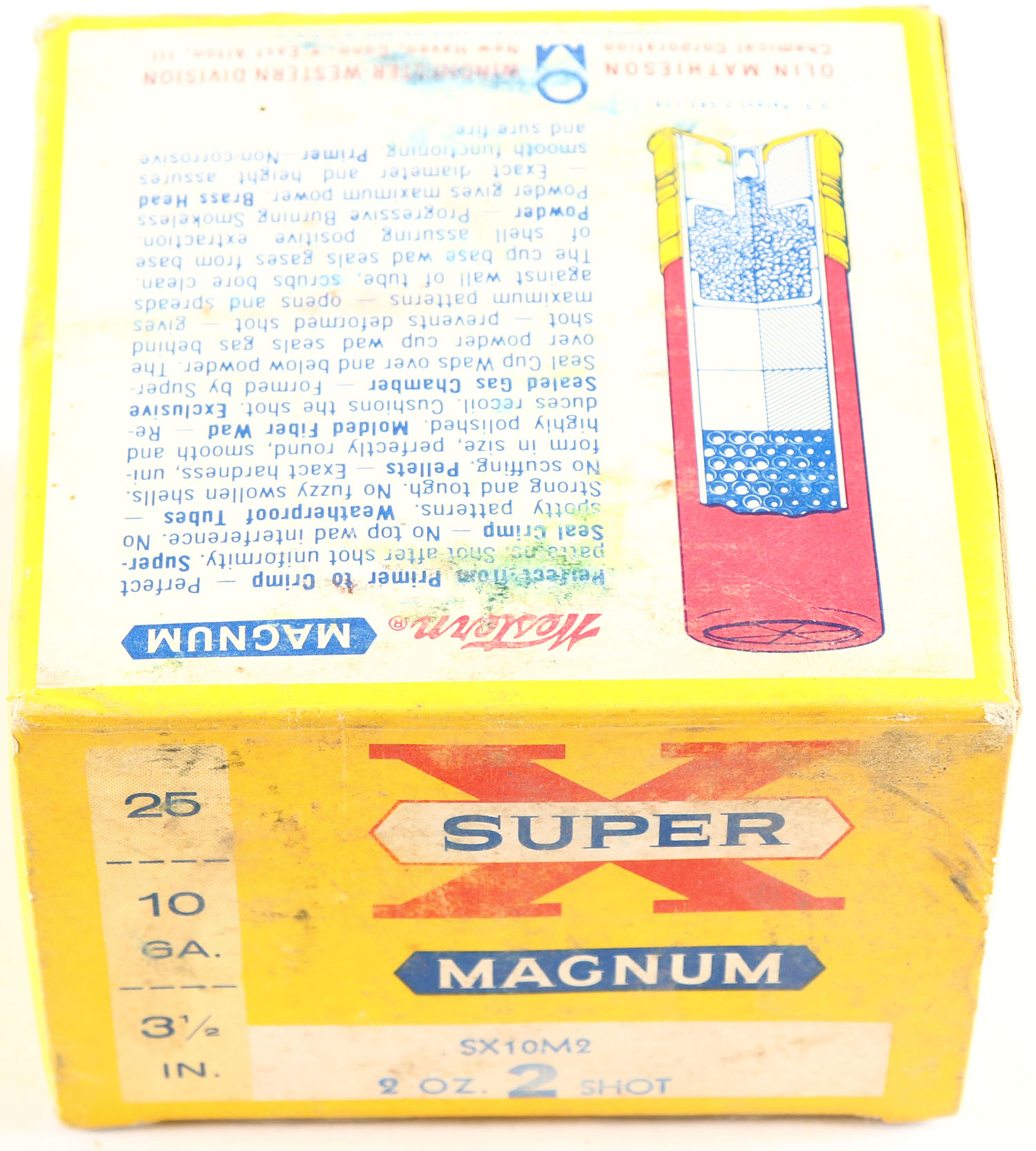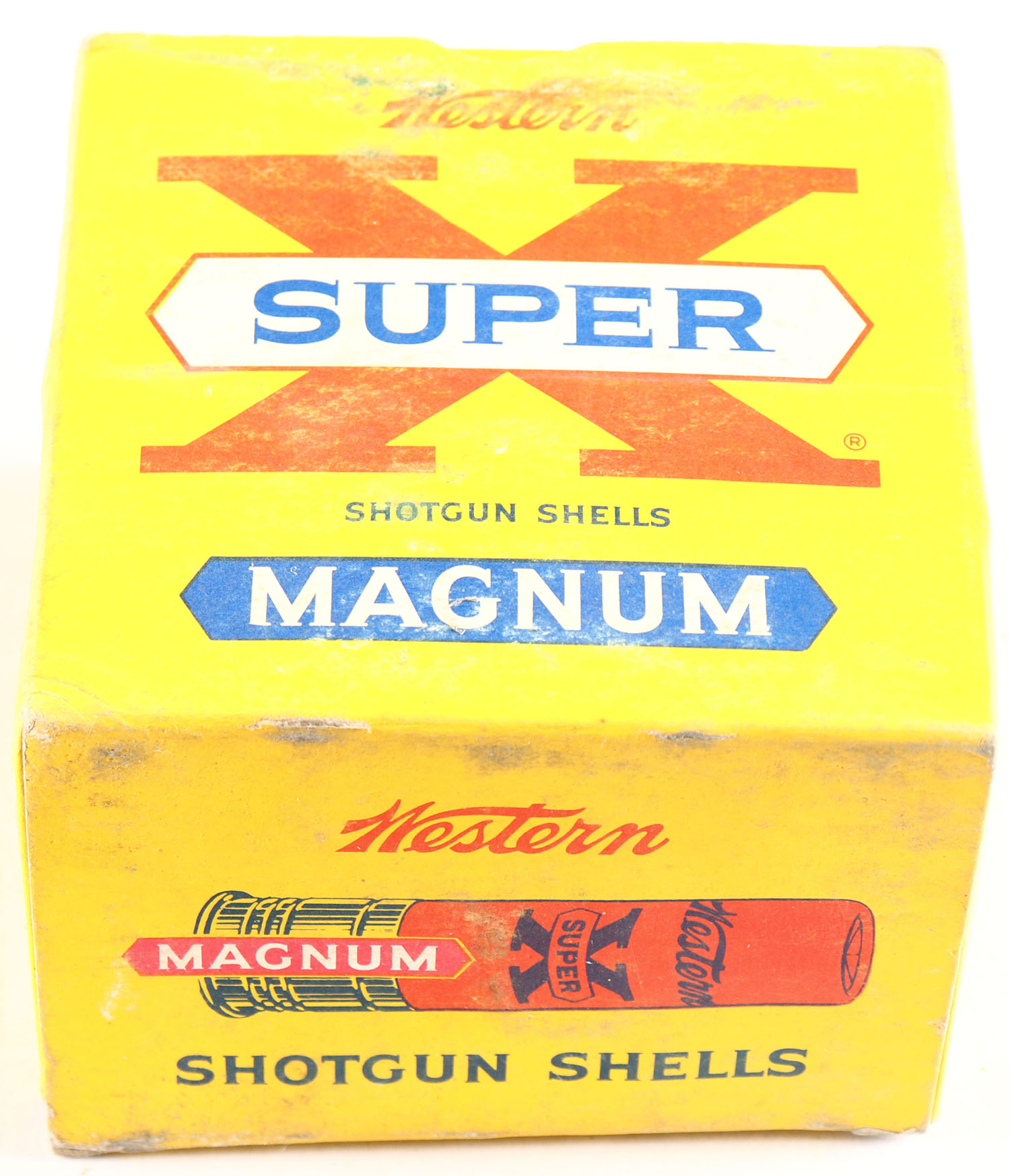 Western, Super X, 10ga., 3 1/2'', 1pc., Full, shot size 2 Magnum, yellow, blue & red box, box is very solid with very light soiling, box has great colors, shells are excellent. Grade: Excellent ++ - Value: 30 to 60