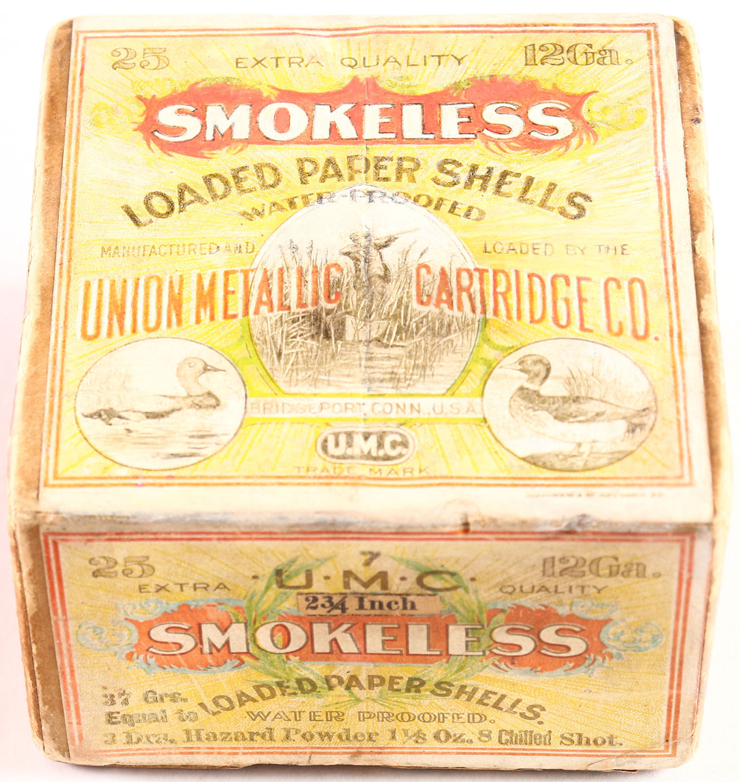 UMC, SMOKELESS, WALKING MAN SERIES, 12ga., 2pc., Empty, shot size 8 CH., buff box with multi colored label pictures hunter shooting from boat in center, Canvasback in bottom left hand corner & a Mallard in the bottom right, box is all original and solid, box has age soiling & light scuffing with wonderful colors, VERY HARD TO FIND BOX. Grade: Excellent - Value: 1000 to 4000