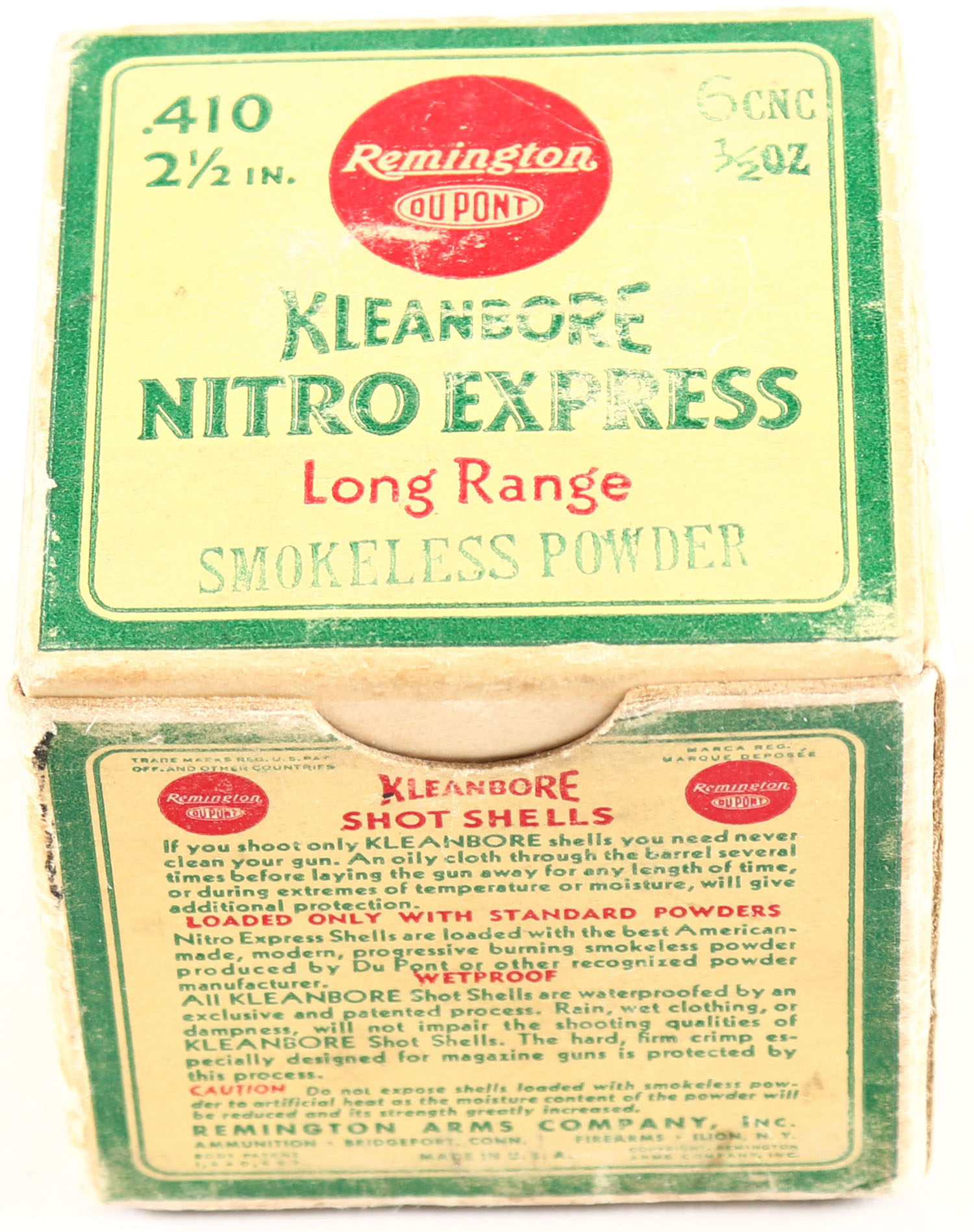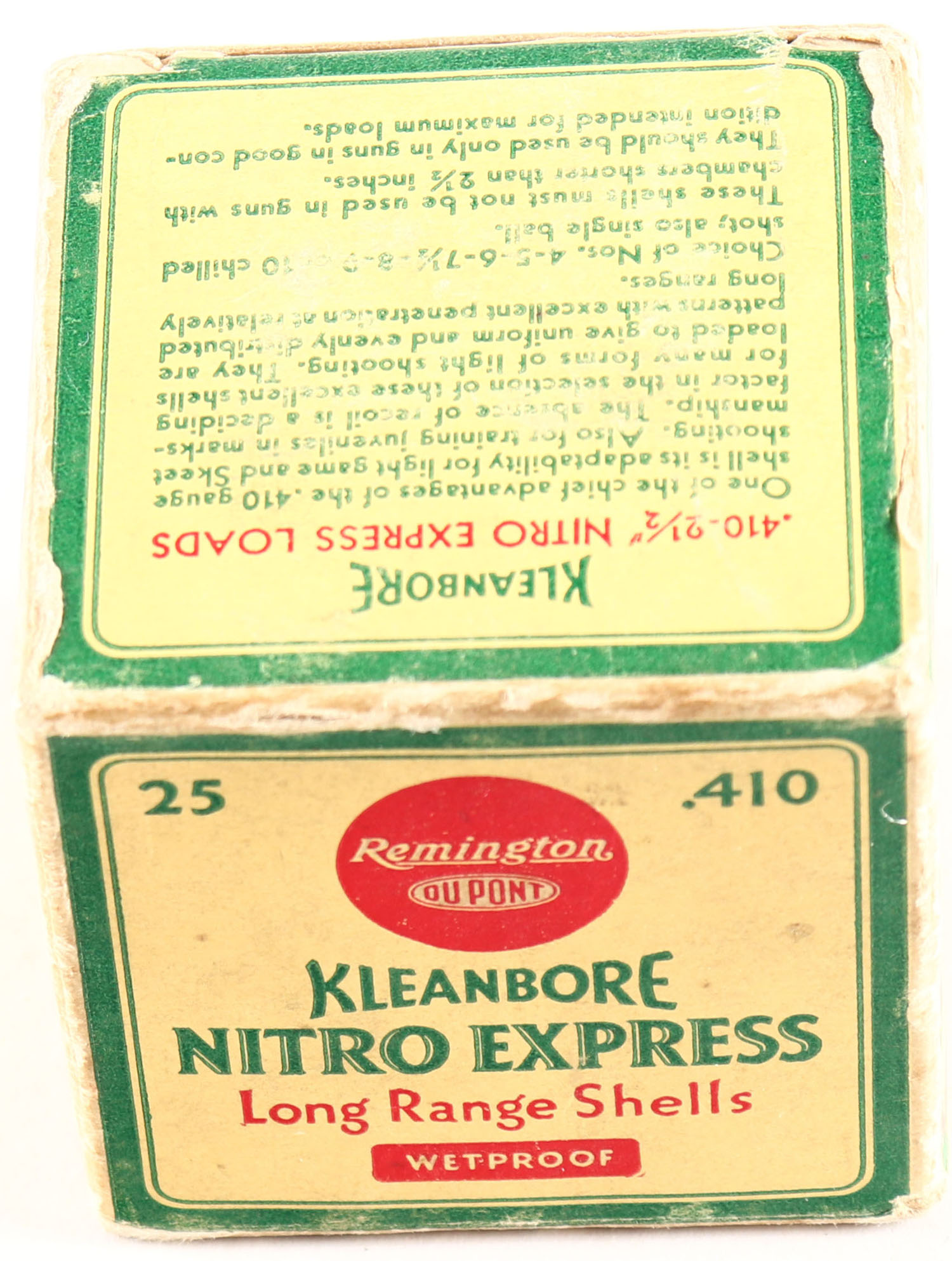 Remington, Kleanbore, NITRO EXPRESS, 410ga., 1pc., Full, shot size 6 1/2 CNC, 2 1/2'', box is yellow, red and green, box is solid, has soiling with great colors, shells are excellent. Grade: Excellent - Value: 20 to 60
