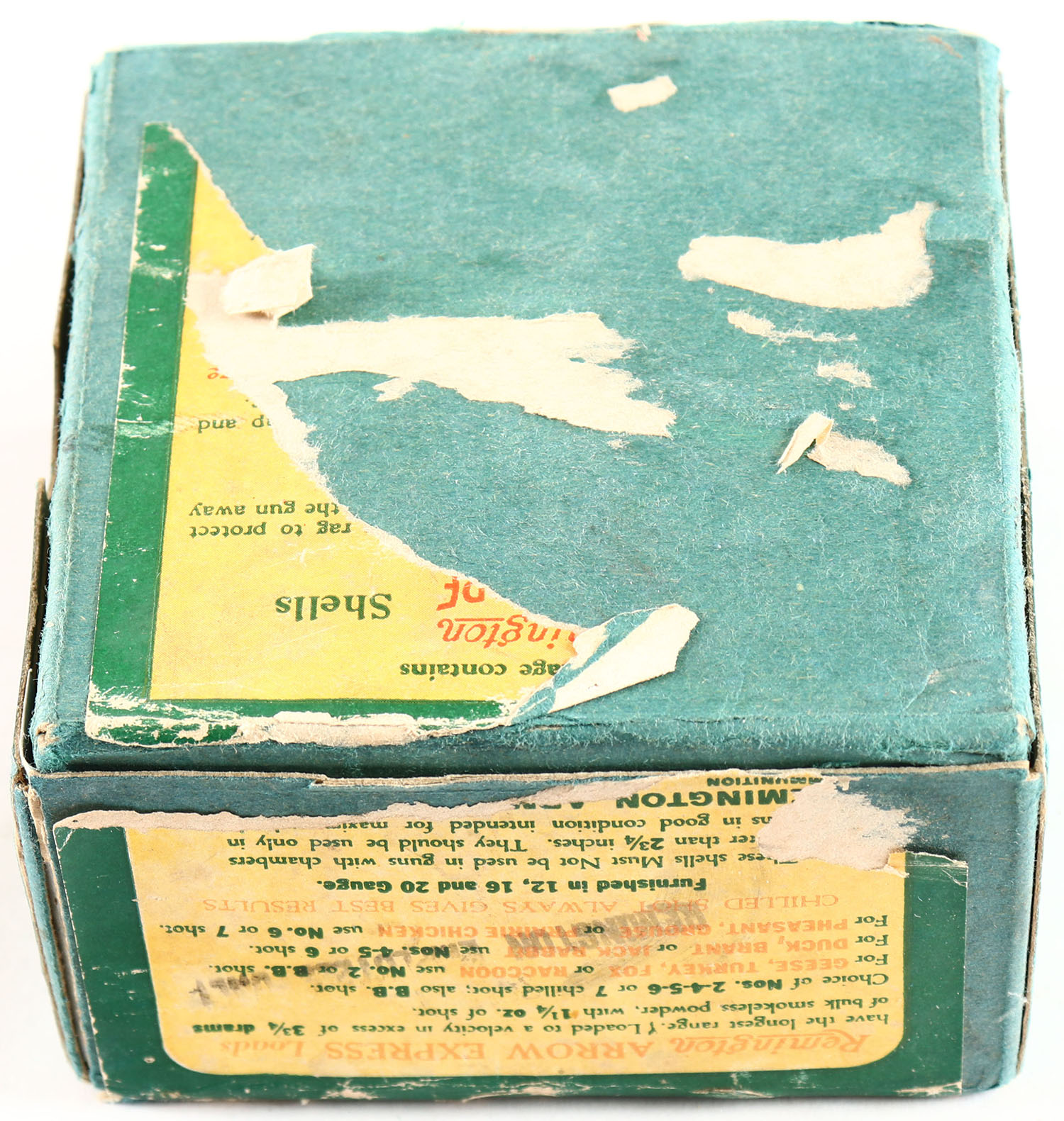 Remington UMC Arrow Express, 12ga., 2pc., Partial 15 rds., shot size 4C, green box with sunburst logo, box has scuffing & soiling with nice colors to label, shells are fair. Grade: Very Good + - Value: 40 to 100