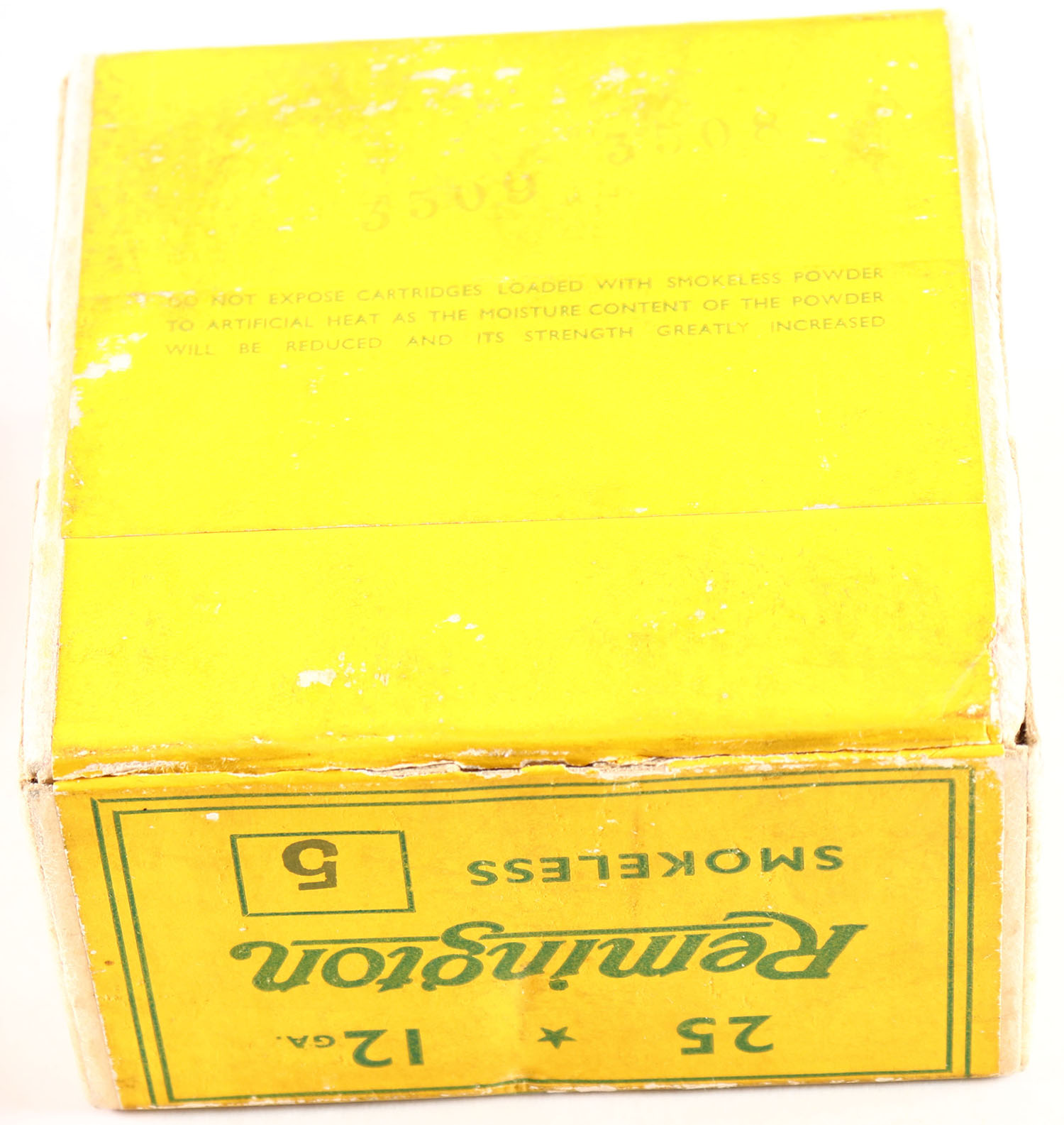 Remington, Smokeless, 12ga., 2pc., Empty, shot size 5, buff box with green & yellow label, box is very solid with light scuffing, has excellent label. Grade: Very Good ++ - Value: 40 to 100