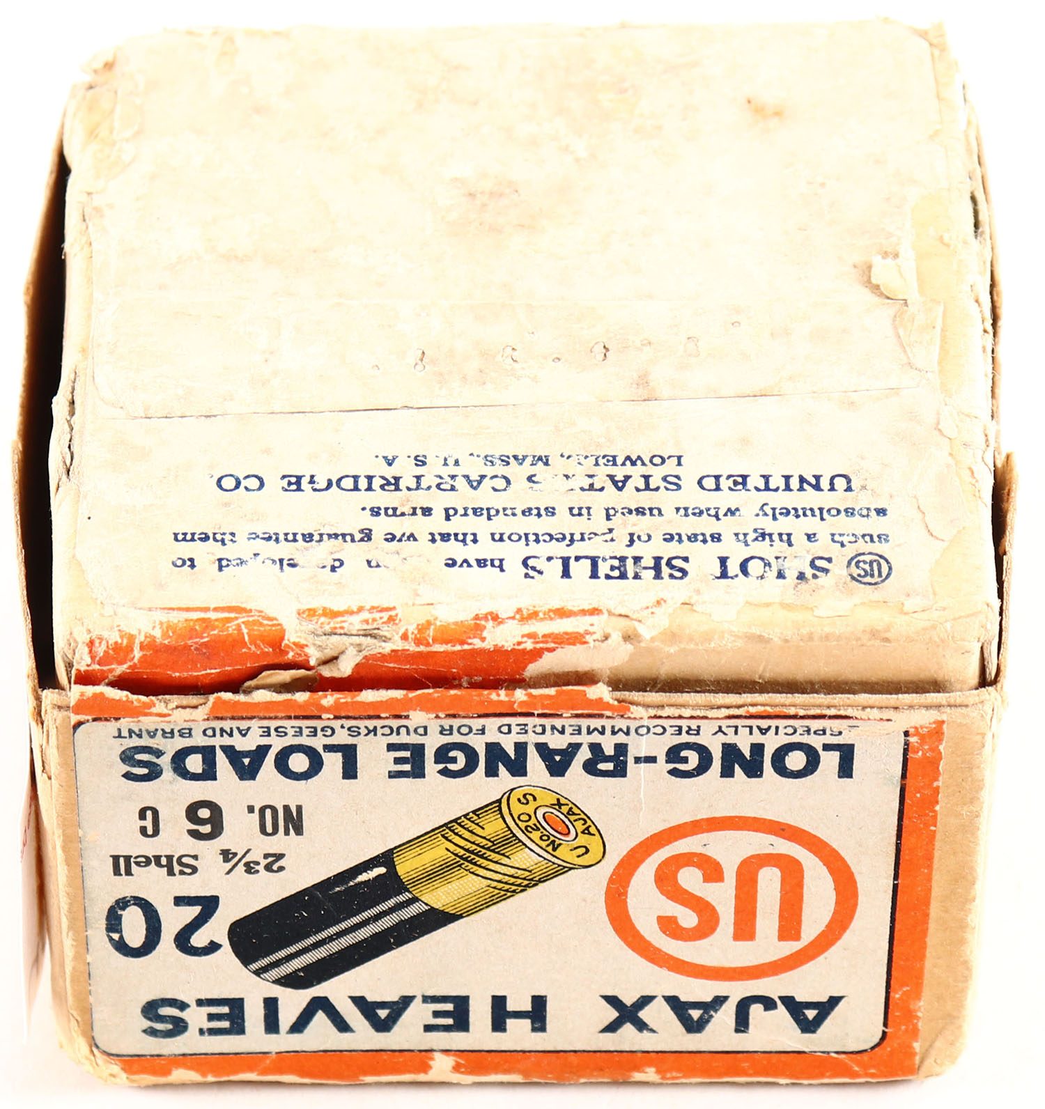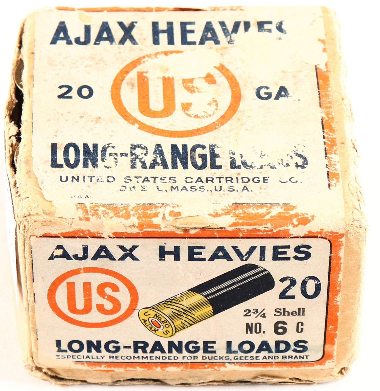 U.S. Cart. Co., New York, NY, AJAX HEAVIES, 20ga., 2pc., Full, shot size 6C, buff box with white, orange & blue paper label, box has seam split with scuffing & soiling, shells are very good. Grade: Good ++ - Value: 40 to 100