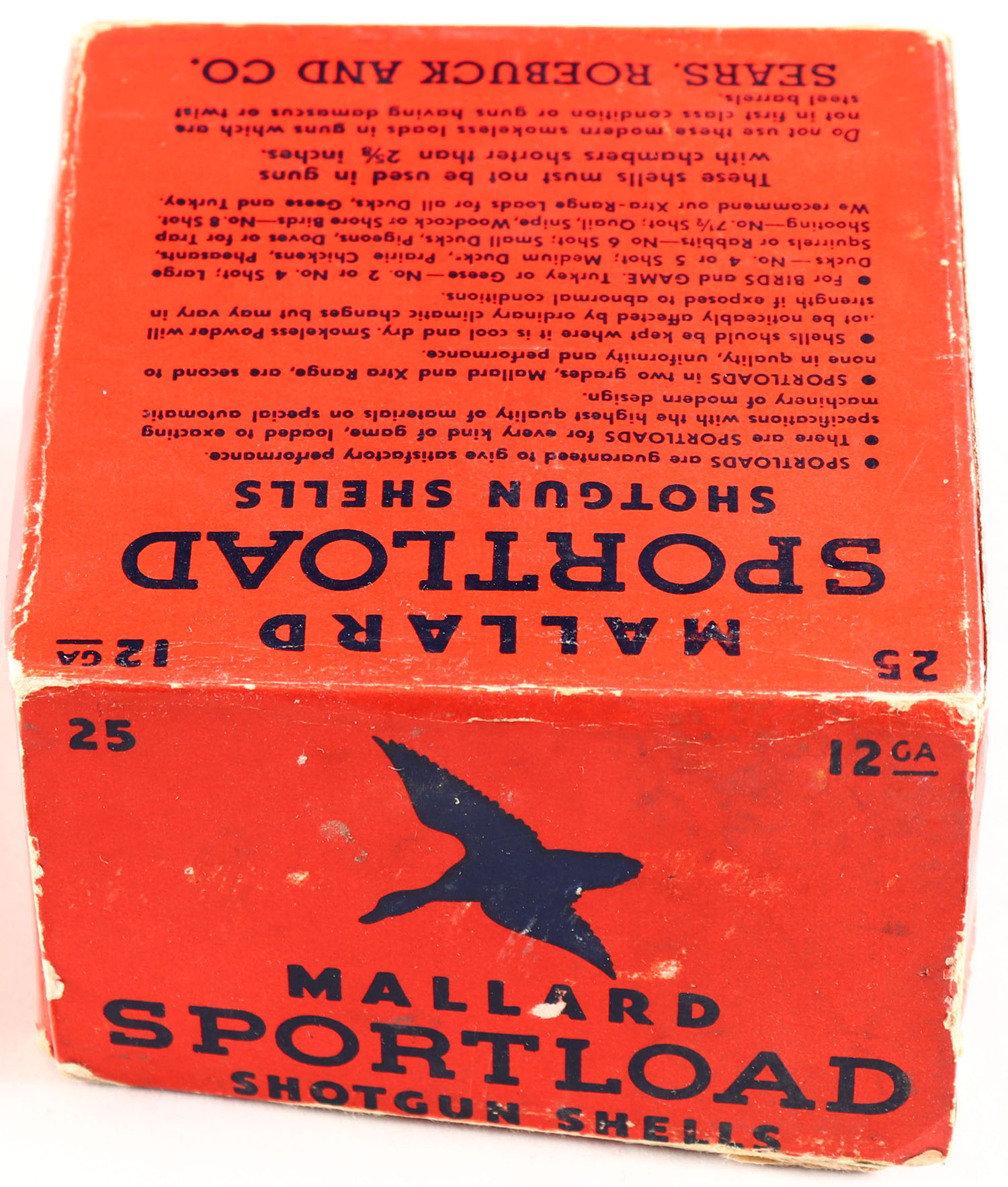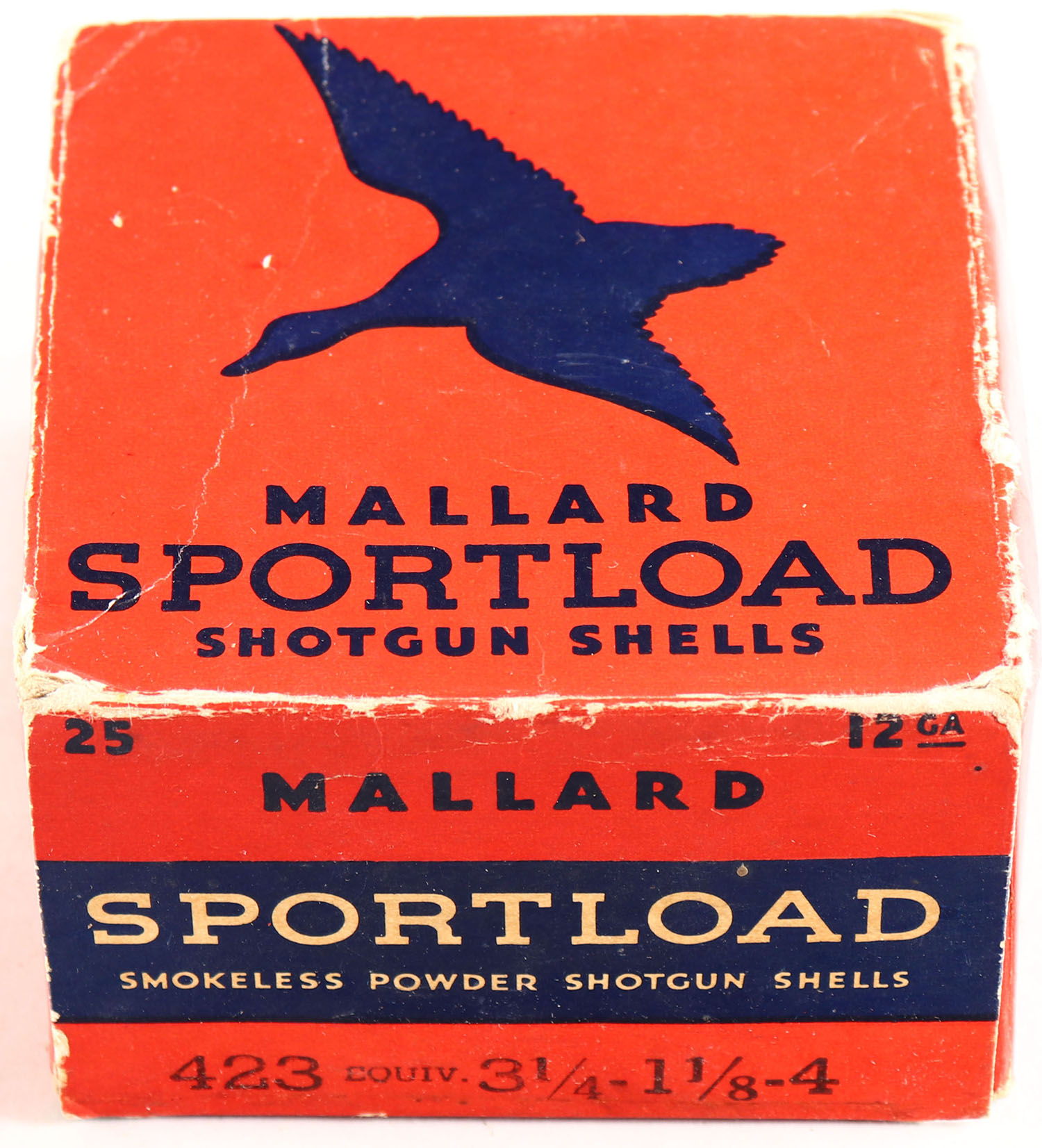 Sears, Sportload MALLARD, 12ga., 1pc., Full, shot size 4, red & blue box that pictures a Mallard in flight, box is solid with light soiling, edge wear & great colors, shells are excellent. Grade: Very Good ++ - Value: 30 to 60