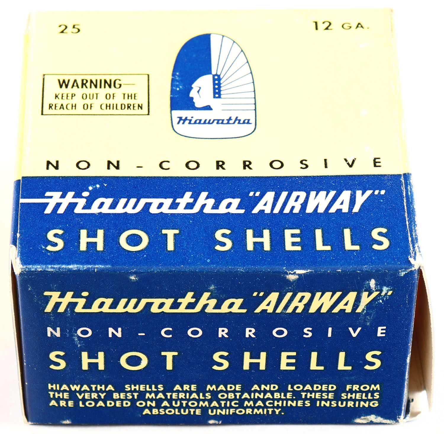Gambles, Hiawatha Airway, 12ga., 1pc., Full, shot size 7 1/2, yellow, blue & white box, box is solid with very nice color, shells are excellent. Grade: Excellent ++ - Value: 40 to 100