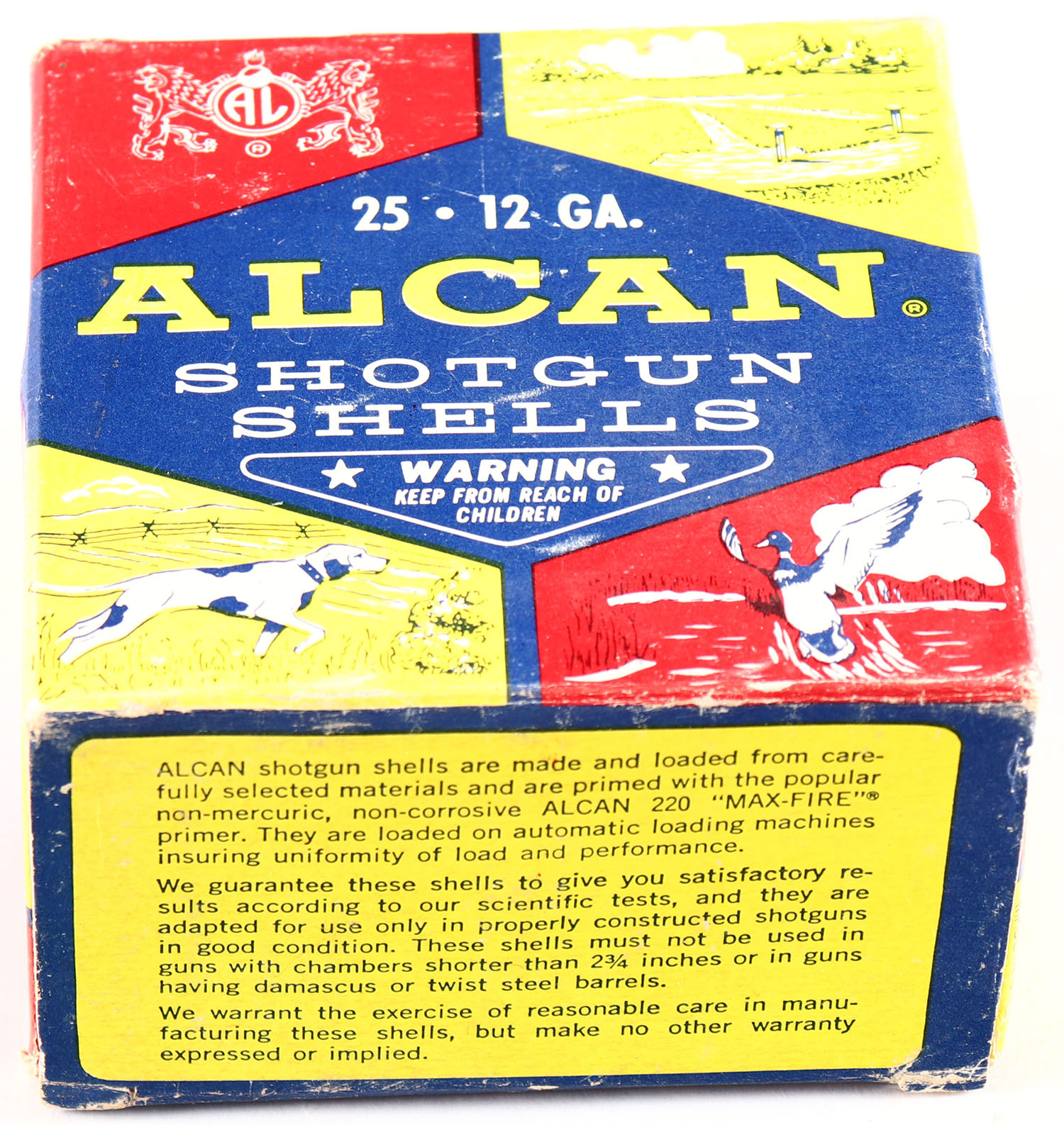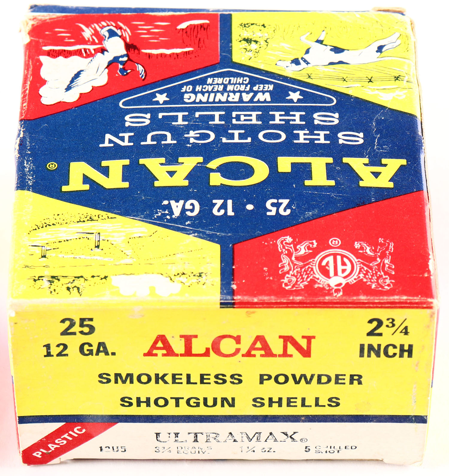Alcan, Smokeless Powder, 12ga., 2 3/4'', 1pc., Full, shot size 5CH, multi-colored box, box is solid with great colors, shells are excellent. Grade: Excellent - Value: 10 to 40
