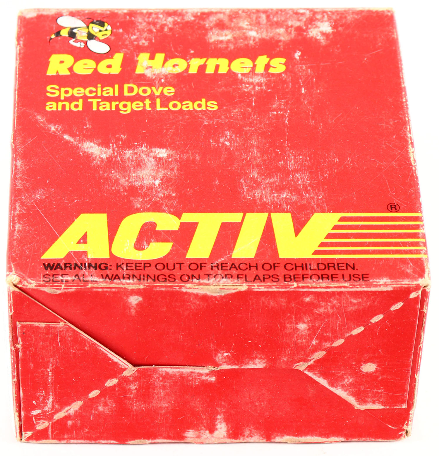 Activ, Red Hornets, 12ga., 1pc., Full, shot size 7 1/2, box is very solid, shells are excellent. Grade: Very Good ++ - Value: 10 to 20