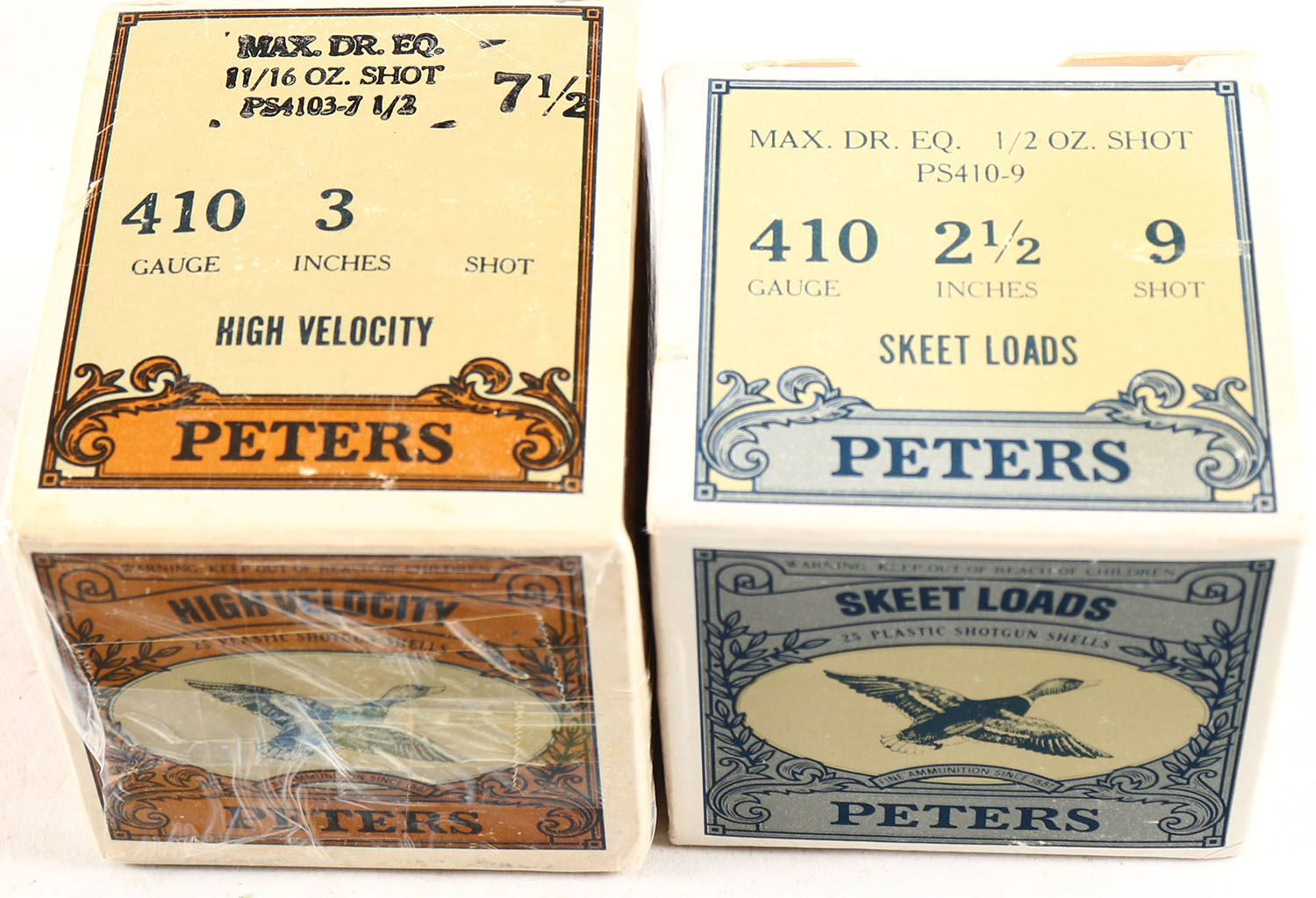 Lot of 2 Peters, 410ga., 1pc., Appears Full, shot size 7 1/2 & 9, multi-colored boxes. Grade: Very Good + - Value: 10 to 60