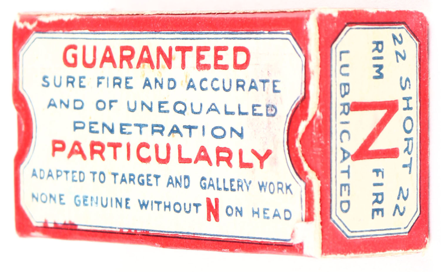 National Cartridge Company, Nublend Powder, .22 Short, Lubricated, RHWeb: NCC-1 S-3, Full, 1pc. White & red box, box is solid with excellent color, very minor edge & corner wear, end flaps are solid, ammo is good. Grade: Excellent - Value: 200 to 600