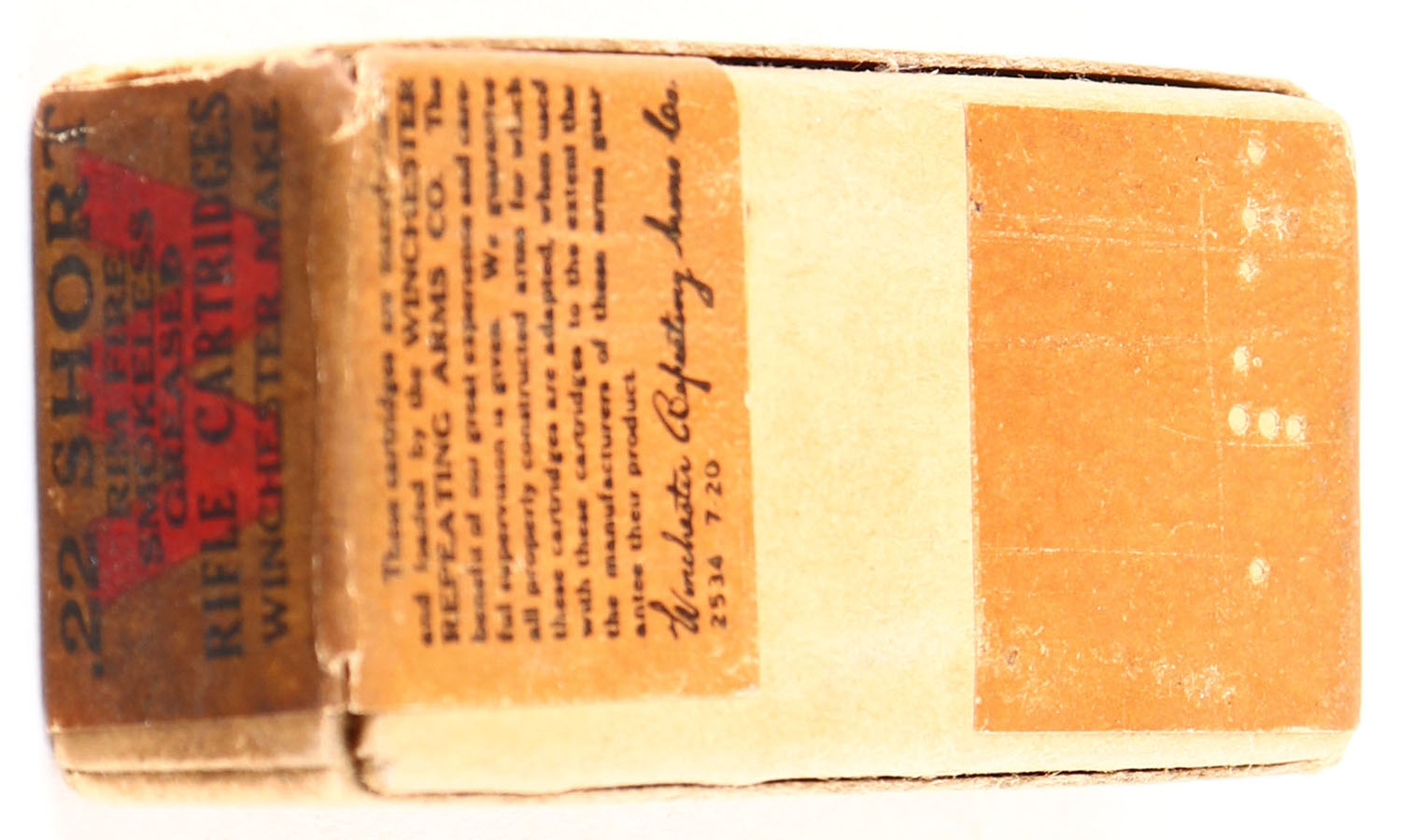 Winchester, Smokeless Rifle Cartridges, .22 Short, RR: WRA-177 S-61a, FULL & SEALED, 2pc. Buff box with green and brown wraparound label, box is solid with excellent color, minor age soiling, very minor shelf & corner wear, very minor edge wear, label is intact. Grade: Excellent + - Value: 250 to 500