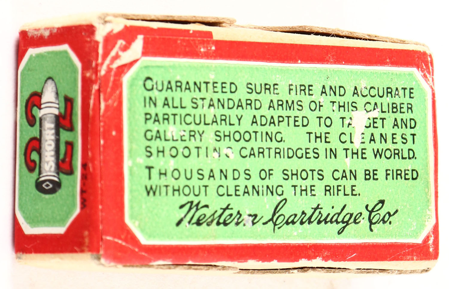 Western, Rim Fire Cartridges, .22 Short, Lesmok Powder, RHWeb: WCC-3 S-2b, FULL & SEALED, 2pc. Buff box with green & red wraparound label, box is near mint with minty color, only very minor chipping to label and shelf wear on bottom, corners are sharp, edges are crisp, label is intact. Grade: Excellent ++ - Value: 50 to 200