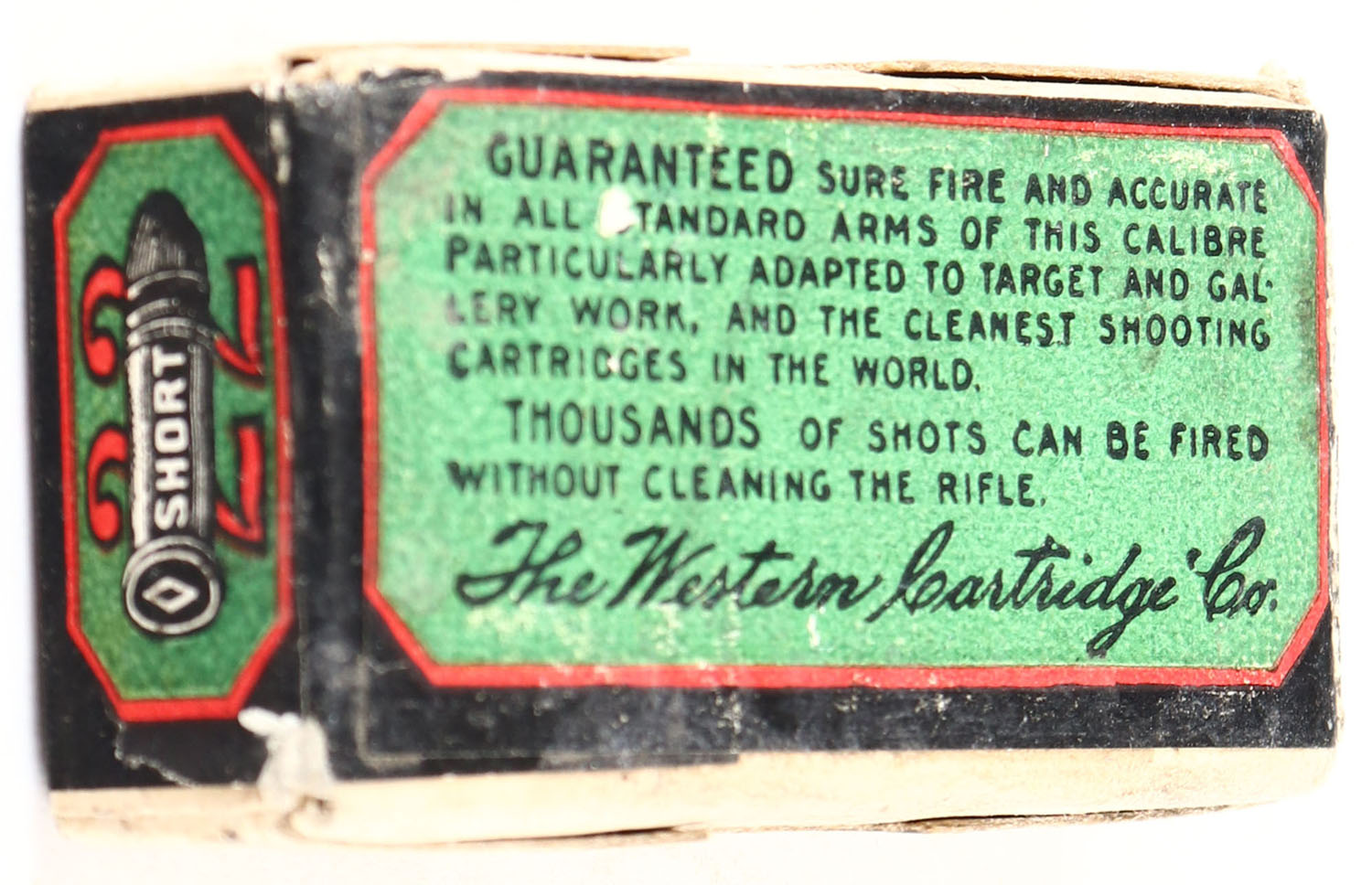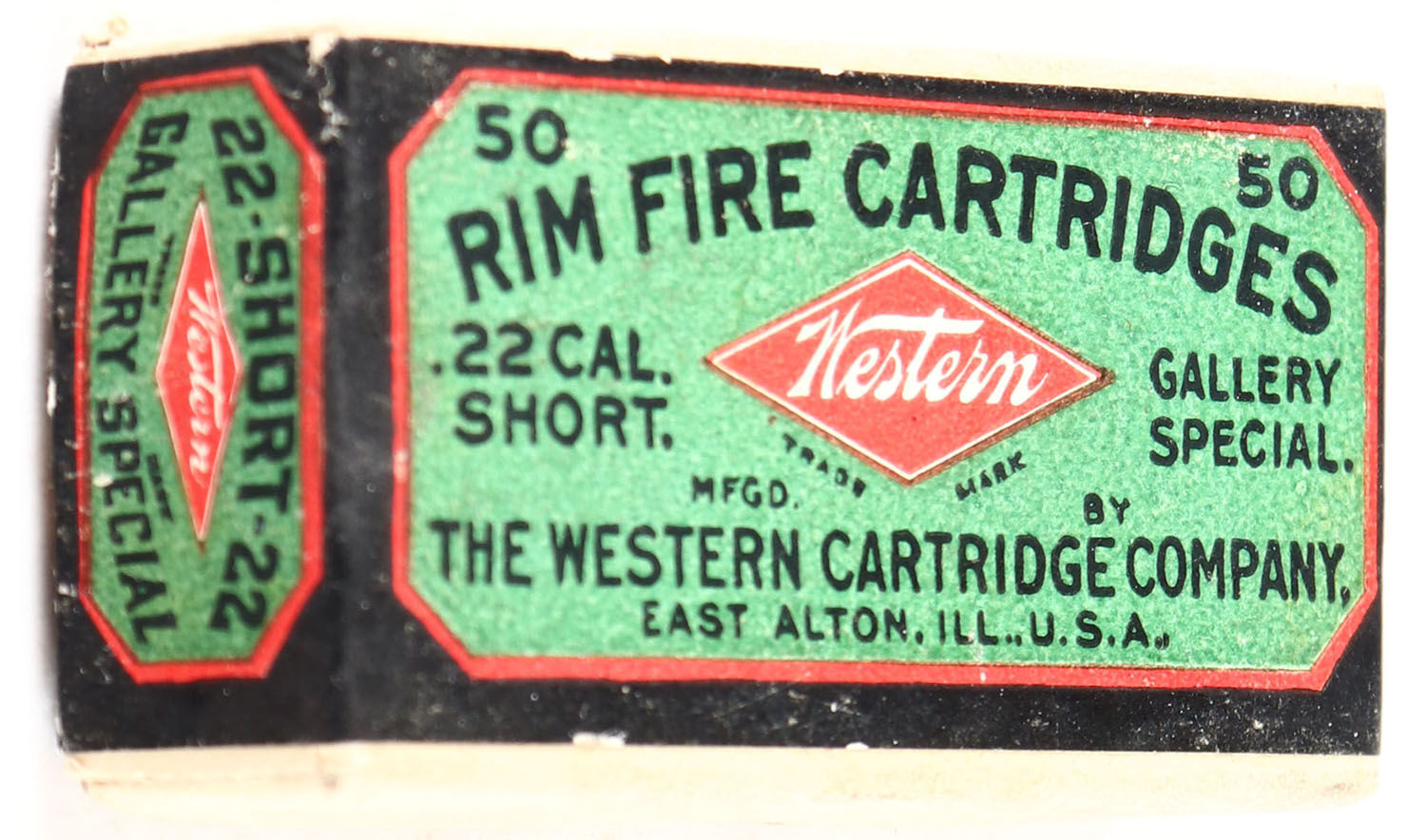 Western, Gallery Special, .22 Short, RHWeb: WCC-48 S-3.2, Full, 2pc. Buff box with green black & red wraparound label, box is solid with excellent color, very minor shelf & corner wear, edges are mostly crisp, label is intact, ammo is good. Grade: Excellent - Value: 50 to 150