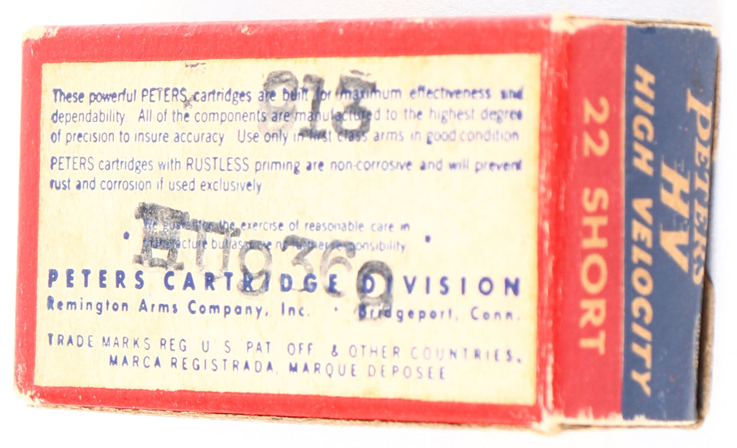 Peters, High Velocity, .22 Short, RHWeb: PCC-17 S-1a, Full, 1pc. Blue red & white box, box is solid with very good color, some age soiling, very minor corner wear, edges are crisp, end flaps are solid, ammo is excellent. Grade: Excellent - Value: 8 to 40
