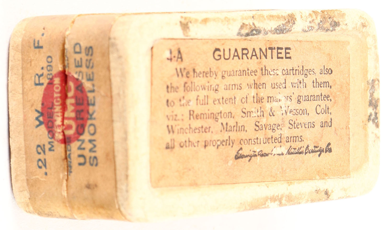 REM-UMC, Rim Fire Cartridges, .22 Winchester Rim Fire, RHWeb: REM-1 WRF-4, FULL & SEALED, 2pc. Buff box with buff top & side sealing labels, box is solid with very good color, some age soiling, minor edge & corner wear, top has been written on, labels are intact. Grade: Excellent - Value: 40 to 160