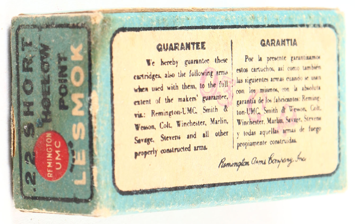 REM-UMC, R.F. Lesmok, .22 Short Hollow Point, RHWeb: REM-5 S-3, Full, 1pc. Blue black & red box, box is solid with very good to excellent color, minor age soiling & shelf wear, minor edge & corner wear, end flaps are solid, ammo is very good. Grade: Excellent - Value: 40 to 200