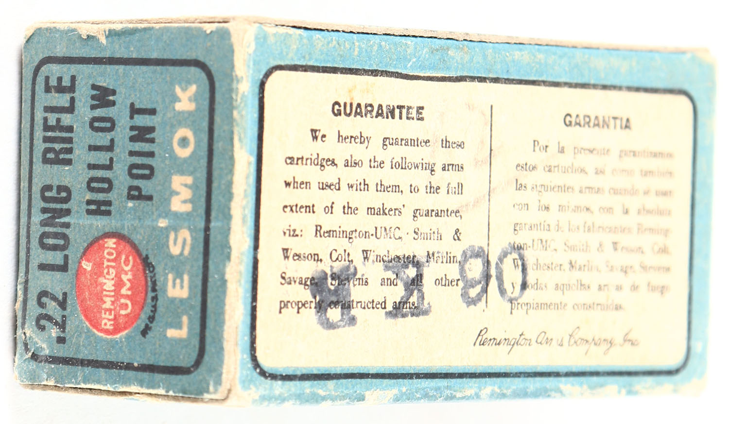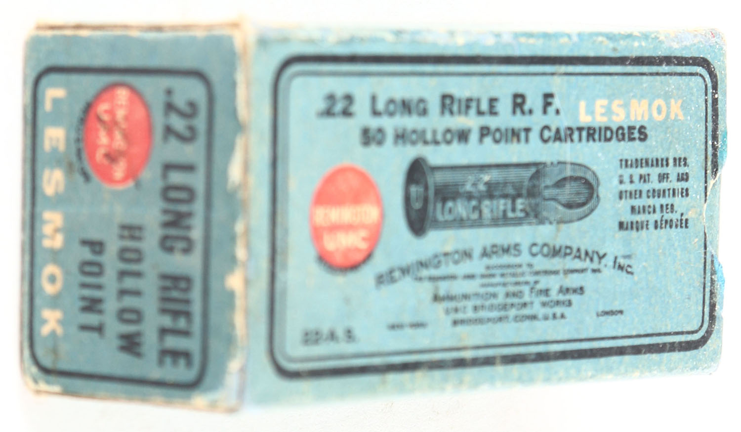 REM-UMC, R.F. Lesmok, .22 Long Rifle Hollow Point, RHWeb: REM-5 LR-5, Partial 44rds., 1pc. Blue black & red box, box is solid with very good to excellent color, minor age soiling & corner wear, very minor edge wear, end flaps are solid, ammo is good. Grade: Very Good ++ - Value: 20 to 60