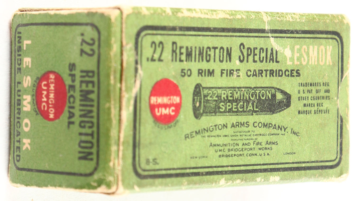 REM-UMC, Lesmok, .22 Remington Special, RHWeb: REM-5 RS-3, Full, 1pc. Green black & red box, right end flap is torn, very good to excellent color, minor age soiling & shelf wear, minor edge & corner wear, left end flap is solid, ammo is excellent. Grade: Very Good + - Value: 50 to 250