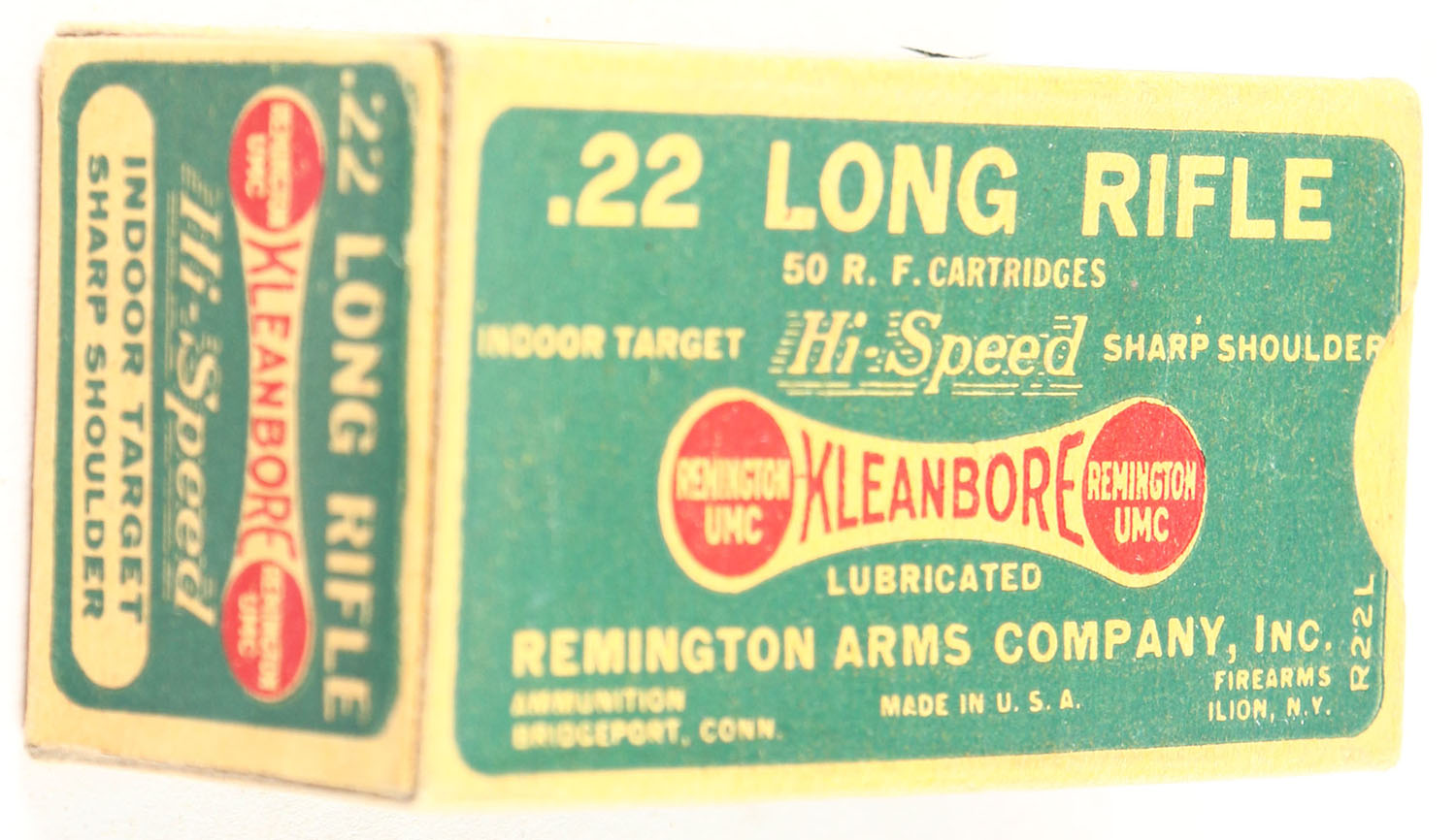 RARE! Remington, Indoor Target Sharp Shoulder, Kleanbore Hi-Speed, .22 Long Rifle, RHWeb: REM-69 LR-1a, Full, 1pc. Green buff & red dog bone box, box is solid with excellent color, very minor corner wear, edges are crisp, end flaps are solid, ammo is very good to excellent. Grade: Excellent + - Value: 30 to 90
