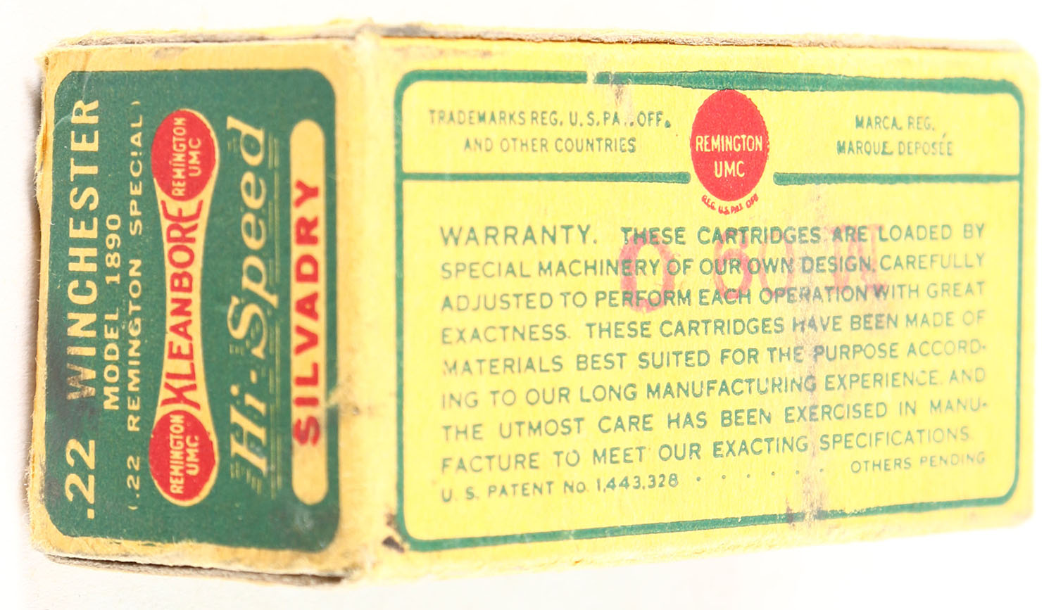 Remington, Hi-Speed Kleanbore Silvadry, .22 Winchester (.22 Remington Special, RHWeb: REM-7.5 WRF-4, Full, 1pc. Green buff & red dog bone box, box is solid with excellent color, very minor age soiling, some corner wear, minor edge wear, end flaps are solid, ammo is excellent. Grade: Very Good ++ - Value: 100 to 300