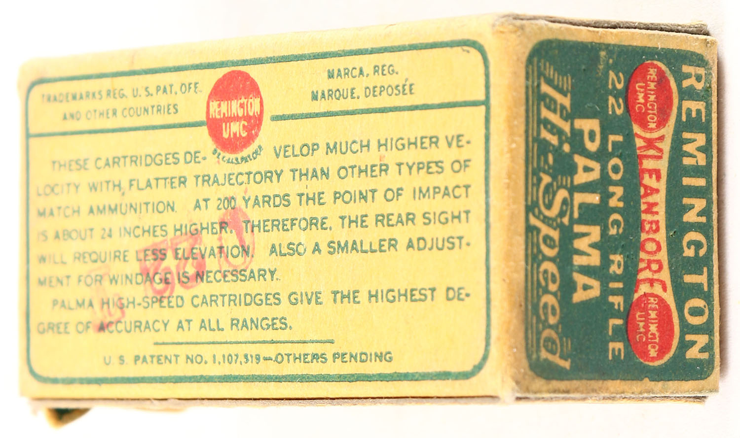 Remington, Palma Hi-Speed Kleanbore, .22 Long Rifle, RHWeb: REM-52 LR-11b, Full, 1pc. Green buff & red dog bone box, box is solid with very good color, some age soiling & shelf wear, corner wear, edges are mostly crisp, end flaps are solid, ammo is excellent. Grade: Very Good ++ - Value: 10 to 50