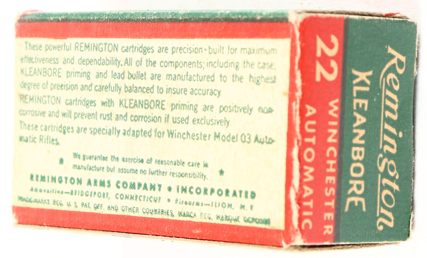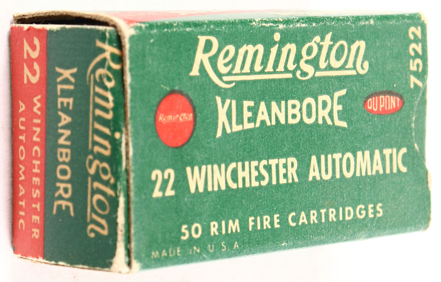 Remington, Kleanbore, .22 Winchester Automatic, RHWeb: REM-12 WA-1a, Full, 1pc. Green white & red box, box is solid with excellent color, minor corner wear, edges are mostly crisp, end flaps are solid, ammo is excellent. Grade: Excellent + - Value: 10 to 50