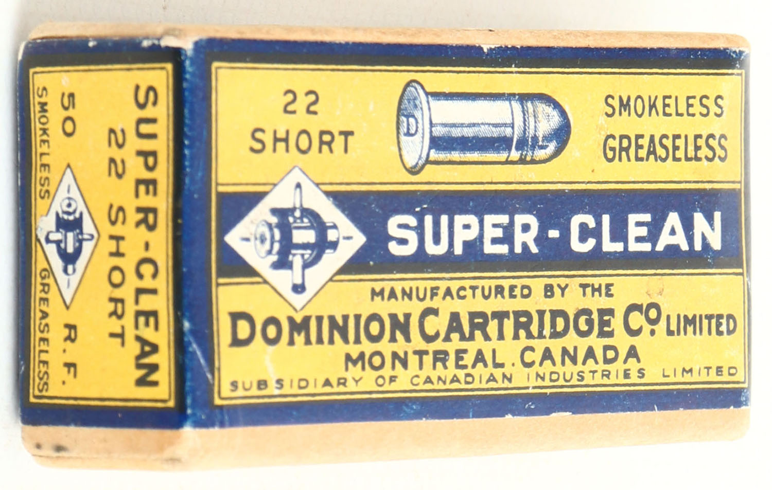 Dominion, Super-Clean, .22 Short, Smokeless Greaseless, RHWeb: D-4 S-2, FULL & SEALED, 2pc. Buff box with yellow & blue wraparound label, box is near mint with minty color, only very minor corner ding on top front corner, very minor shelf wear on bottom, corners are otherwise sharp, edges are crisp, label is intact. Grade: Excellent ++ - Value: 50 to 150