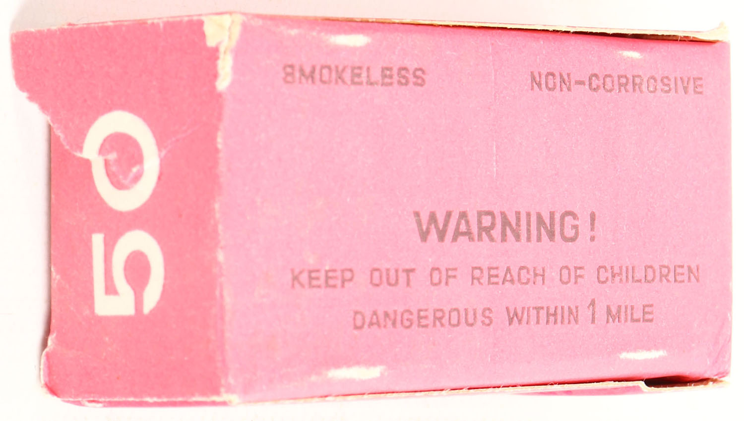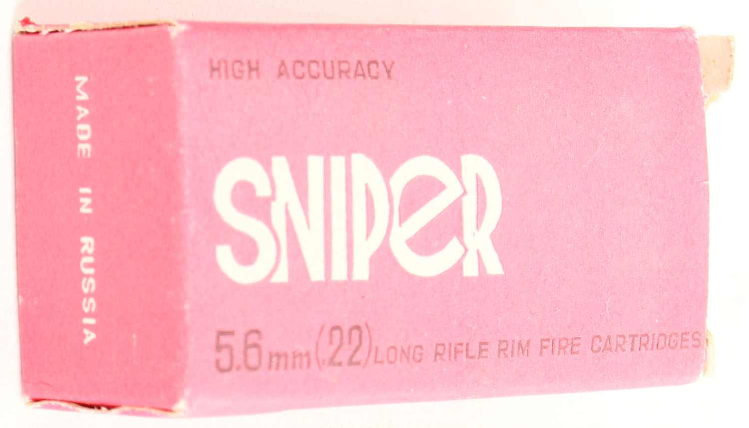 Klimovsk, Sniper, .22 Long Rifle, RHWeb: (USSR) KSP-1 LR-2, Full, 1pc. Red white & black box, box is solid with excellent color, tear on right end flap, very minor corner wear, edges are crisp, end flaps are solid, ammo is excellent. Grade: Excellent - Value: 10 to 50