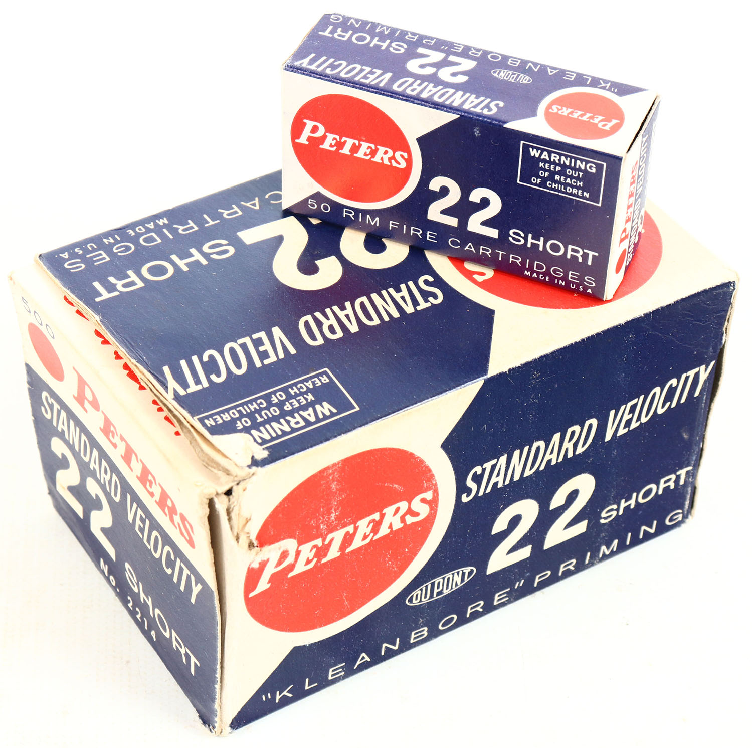 Peters, Standard Velocity, .22 Short, Partial 4 boxes, 1pc. Blue white & red brick, brick is solid with very good color, minor age soiling & shelf wear, tear on top right corner, edges are crisp, end flaps are solid, inside boxes are minty. Grade: Very Good - Value: 10 to 50