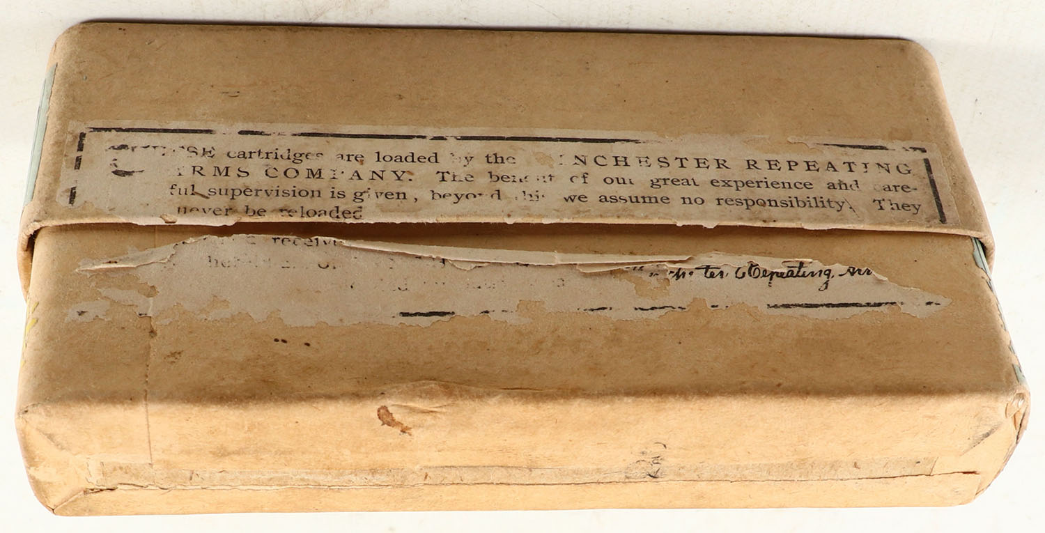 Winchester, Smokeless Cartridges, .38-55, 255 Grains Metal Patched Bullet, Full, 2pc. Buff box with green labels, box is solid with very good color, some age soiling & color fading, minor edge & corner wear, labels are 99% intact, ammo is very good. Grade: Very Good ++ - Value: 50 to 200