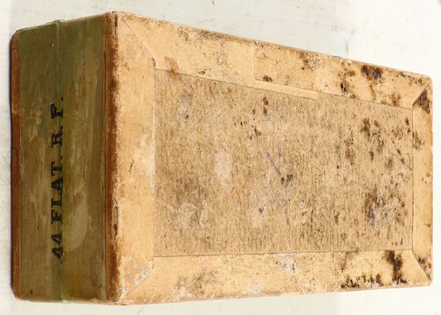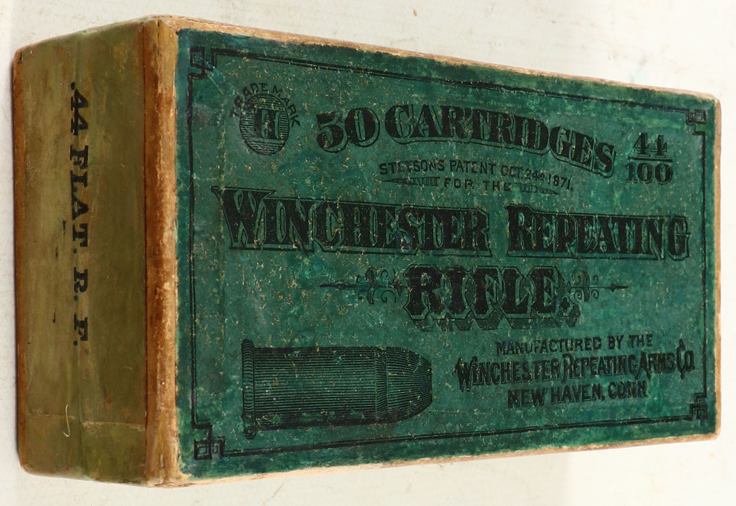 Winchester, .44 Flat Rim Fire, Correct ammo & sealed on one side, 2pc. Buff box with green top & side sealing label, side sealing label has been professionally touched up, box is solid with very good color, minor age soiling & shelf wear, minor edge & corner wear, labels are intact. Grade: Excellent - Value: 2000 to 5000