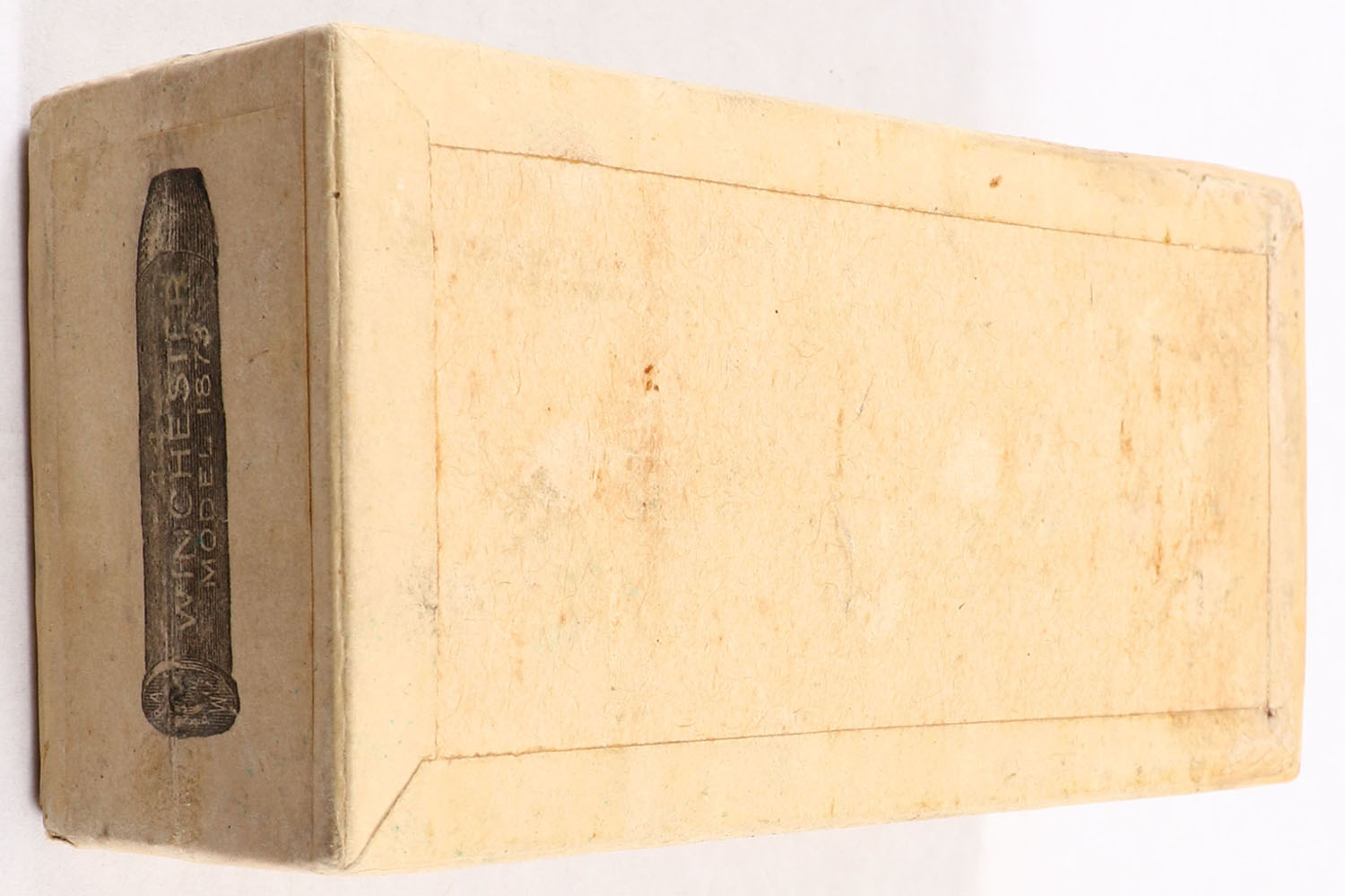 Winchester, Central Fire Solid Head, .44 Winchester Center Fire, FULL & SEALED, 2pc. Buff box with green top & buff side sealing labels, box is solid with excellent color, very minor shelf & corner wear, edges are crisp, labels are intact. Grade: Excellent + - Value: 400 to 1200