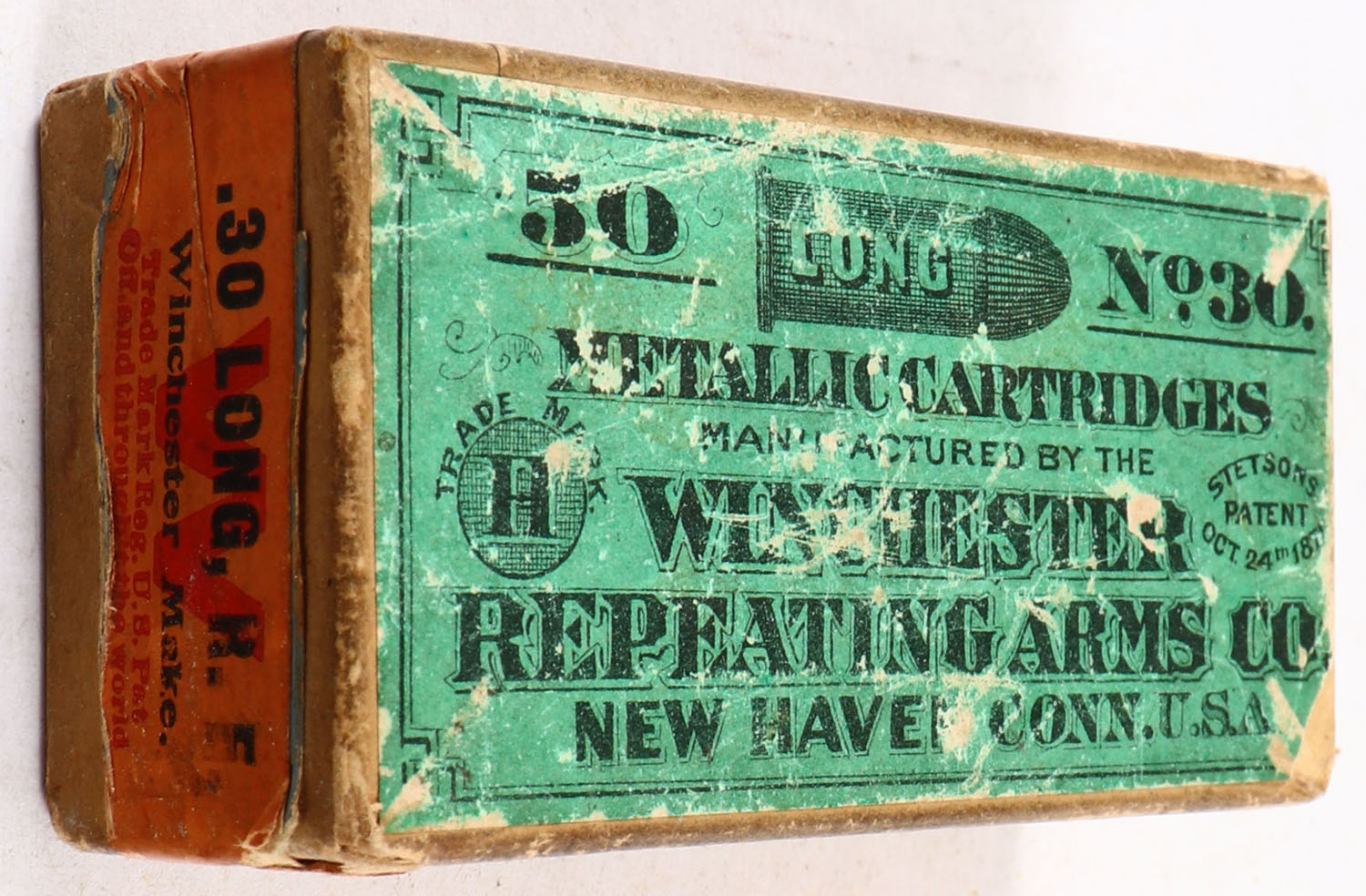 Winchester, Metallic Cartridges, .30 Long Rim Fire, FULL & SEALED, 2pc. Buff box with green top & orange side sealing labels, box is solid with very good to excellent color, minor age soiling, some shelf & corner wear, very minor edge wear, labels are intact. Grade: Very Good ++ - Value: 30 to 90
