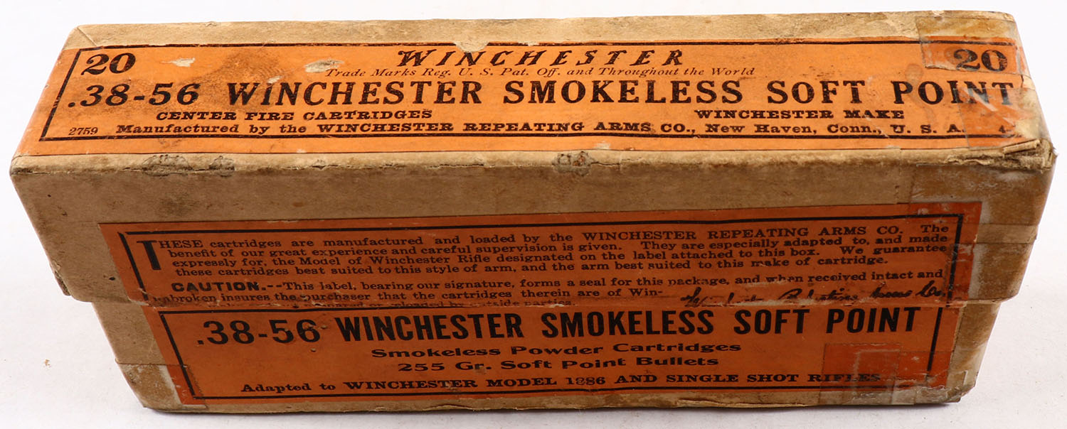 Winchester, Smokeless Powder Cartridges, .38-56 Winchester, 255 Gr. Soft Point Bullets, Full, 2pc. Buff box with orange labels, box is solid with very good color, minor age soiling & color fading, tape on both ends, some edge & corner wear, labels are intact, ammo is very good. Grade: Very Good - Value: 150 to 300