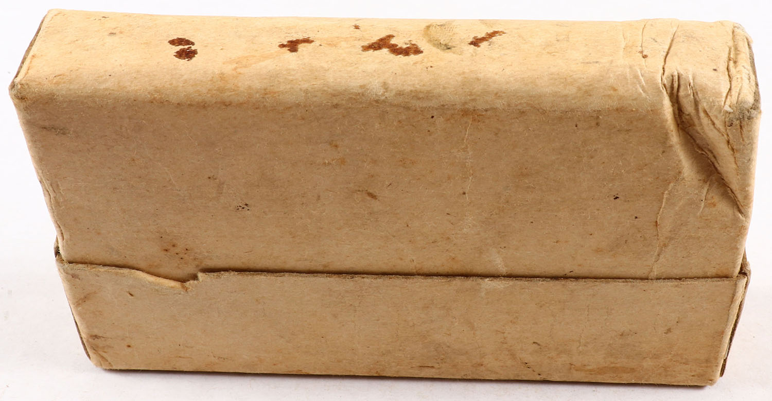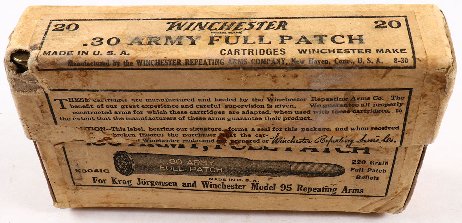 Winchester, .30 Army (30-40 Krag), 220 Grain Full Patch Bullets, Full, 2pc. Buff box with buff label, box is solid with very good color, minor age soiling, some staining, corner ding on bottom corner, tear on top front corner, some edge & corner wear, label is intact, ammo is very good. Grade: Very Good - Value: 10 to 50