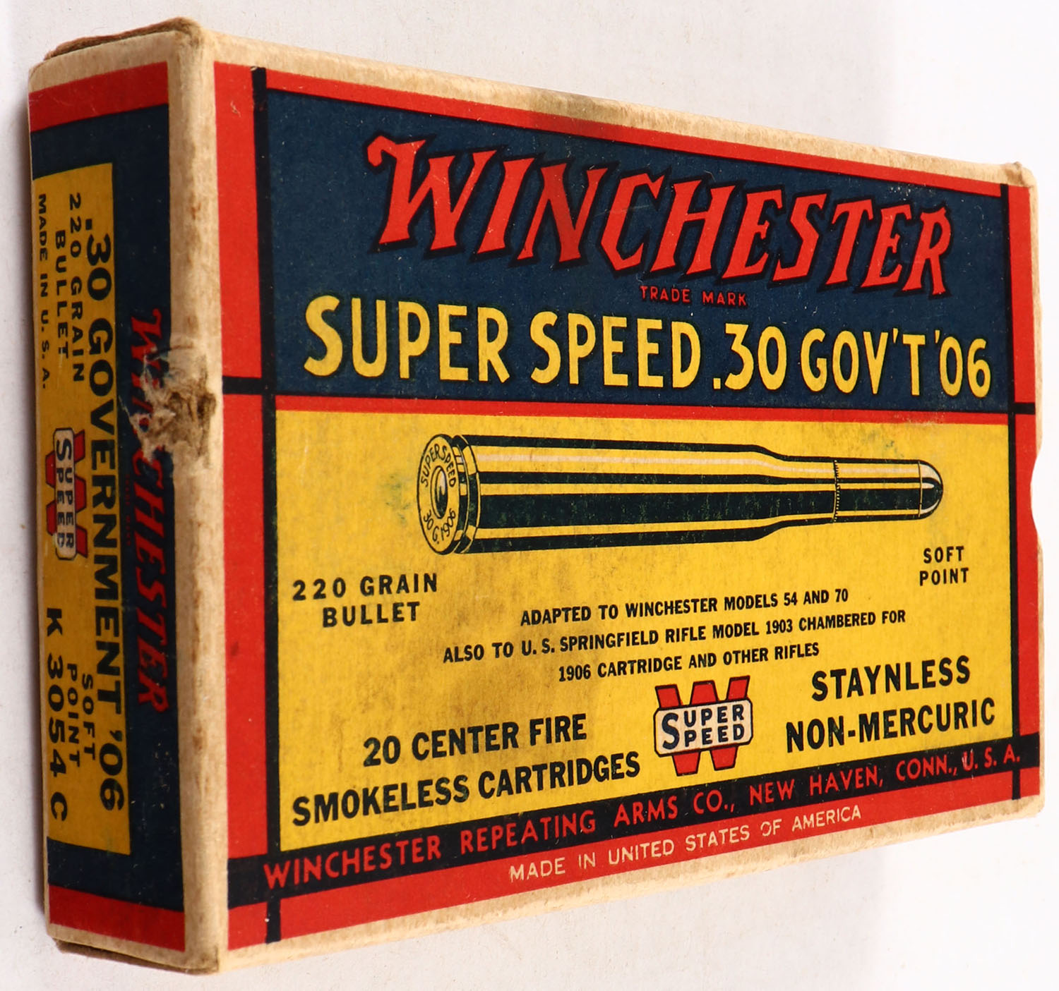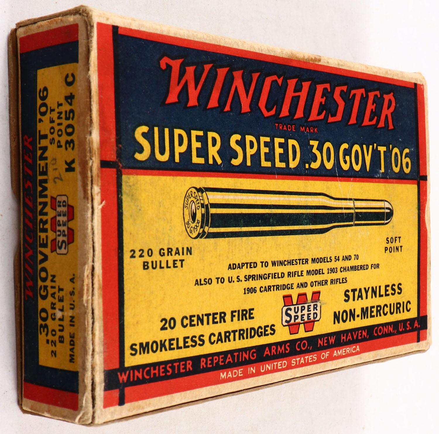 Winchester, Super Speed, .30 Gov't '06 (.30-06), 220 Grain Soft Point Bullet, Full, 1pc. Yellow blue & red box, right end flap is torn, very good to excellent color, minor age soiling, some staining & corner wear, edges are crisp, left end flap is solid, ammo is excellent. Grade: Very Good + - Value: 20 to 60