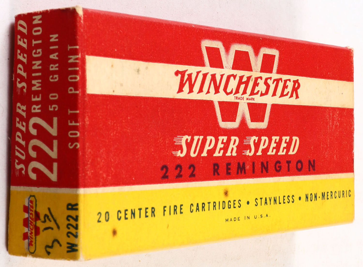 Winchester, Super Speed, .222 Remington, 50 Grain Soft Point, Full, 1pc. Red yellow & white box, box is solid with very good to excellent color, very minor age soiling & shelf wear, minor edge & corner wear, end flaps are solid, ammo is excellent. Grade: Excellent + - Value: 16 to 60