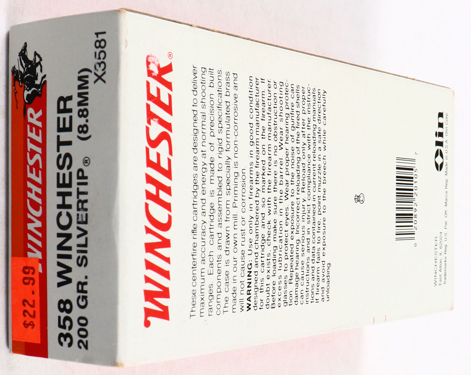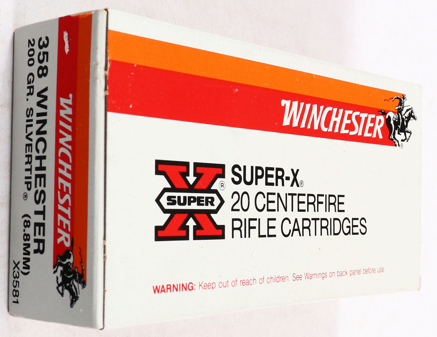 Winchester, Super-X, .358 Winchester (8.8mm), 200 Grain Silvertip, Full, 1pc. Multi-colored box, box is solid with excellent color, edges are mostly crisp, end flaps are solid, ammo is excellent. Grade: Excellent + - Value: 20 to 60