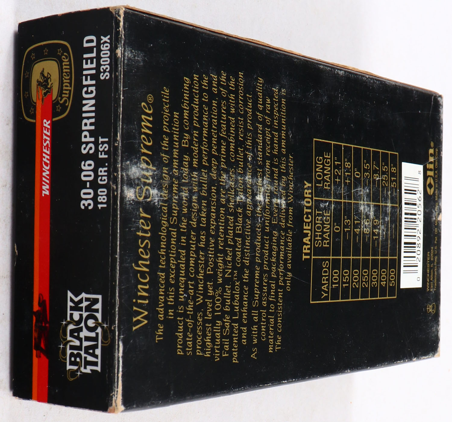 Winchester, Black Talon, .30-06 Springfield, 180 Gr. FST, Full, 1pc. Black red & orange box, box is solid with excellent color, minor shelf wear, very minor edge & corner wear, end flaps are solid, ammo is excellent to minty. Grade: Excellent - Value: 40 to 200
