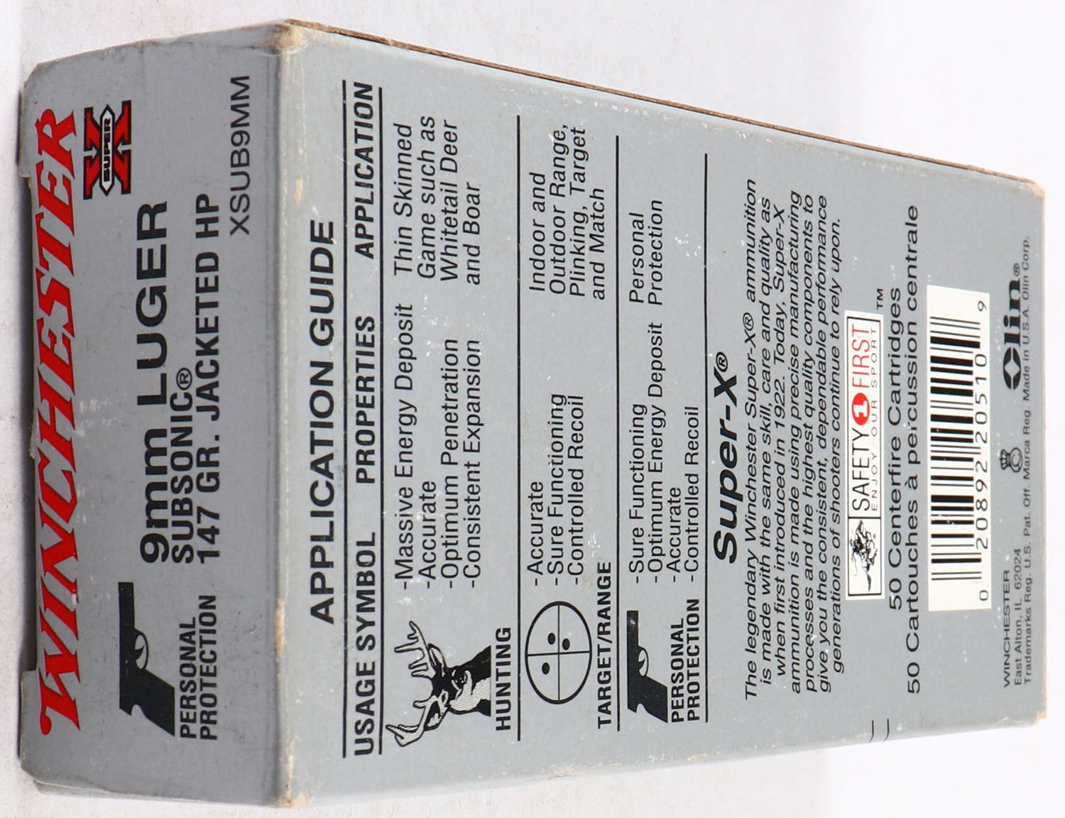 Winchester, Super X, 9mm Luger Subsonic, 147 Grain Jacketed Hollow Point, Full, 1pc., Multi-colored box, box is solid with great color, box has writing on top, Ammo is excellent. Grade: Excellent - Value: 20 to 60