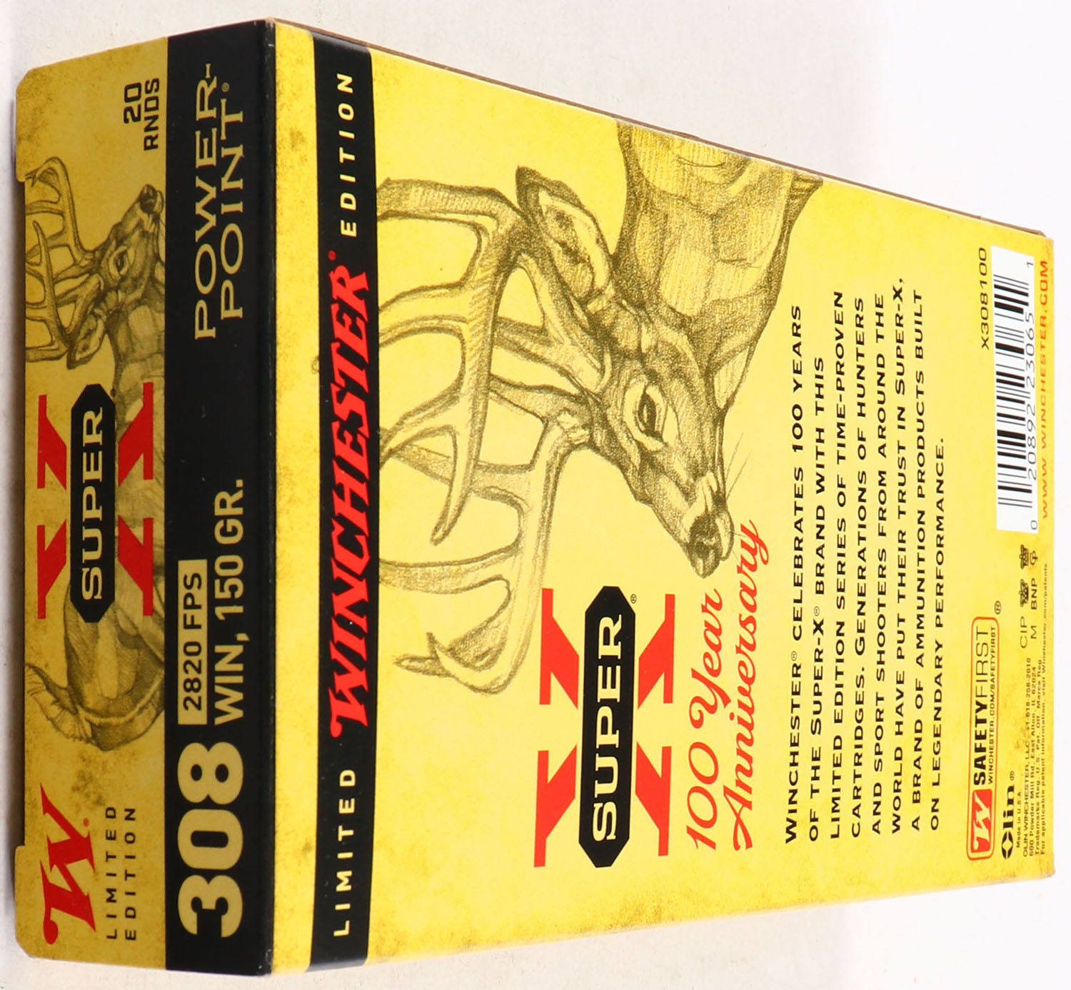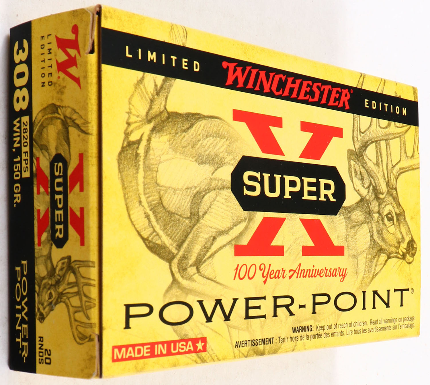 Winchester, Super X, .308 WIN, 150 Grain Power-Point, Full, 1pc. Yellow red & black box, box is MINT with mint color, corners are sharp, edges are crisp, end flaps are solid, ammo is minty. Grade: MINT - Value: 30 to 90