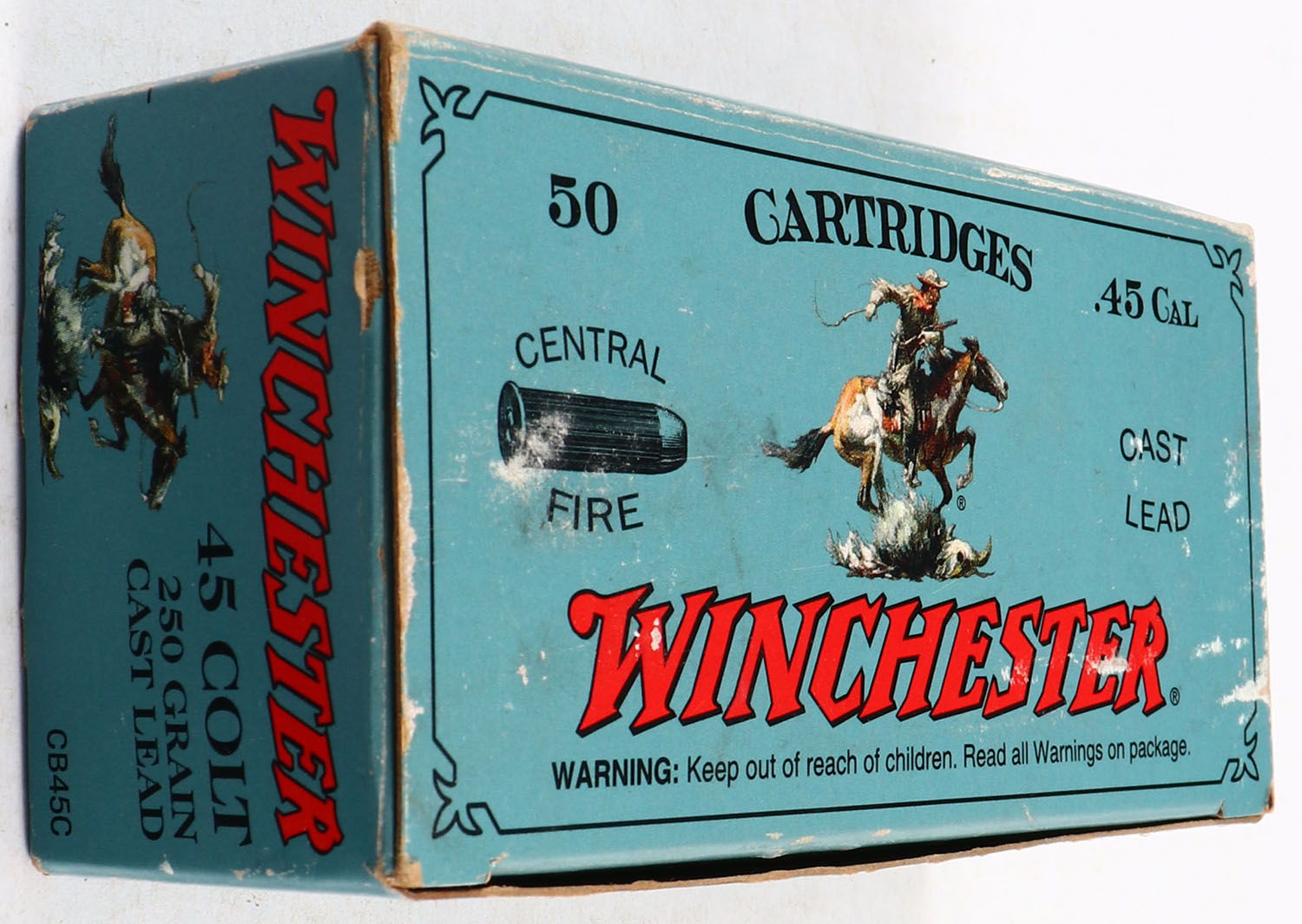 Winchester, Cowboy Action Loads, .45 Colt, 250 Grain Cast Lead, Full, 1pc. Blue box, box is very solid with excellent color, minor shelf & corner wear, edges are mostly crisp, top flap is solid, ammo is excellent to minty. Grade: Excellent - Value: 50 to 150