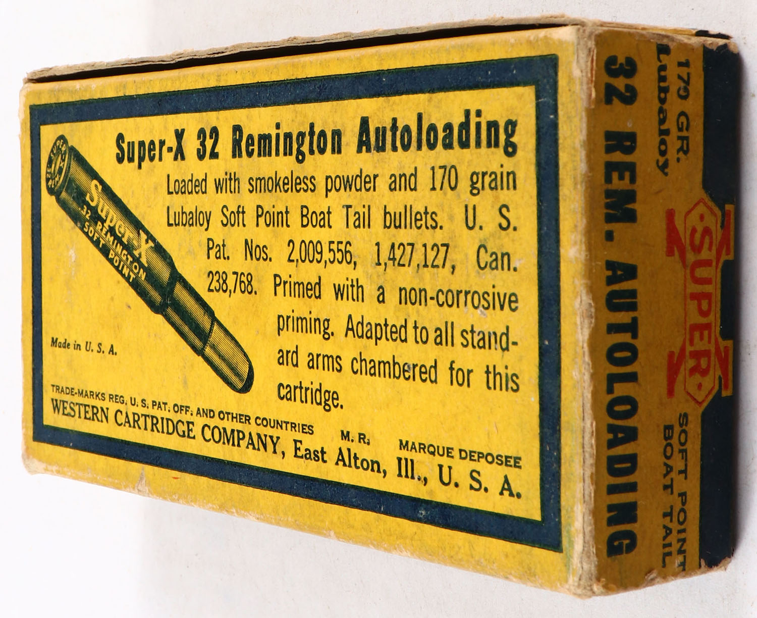 Western, Super-X, .32 Remington Autoloading, 170 Grain Boat Tail, Full, 1pc. Yellow blue & red box, box is solid with very good color, factory seam has unadhered, some age soiling, some age soiling, corner wear, minor edge wear, end flaps are solid, ammo is very good. Grade: Very Good - Value: 30 to 90