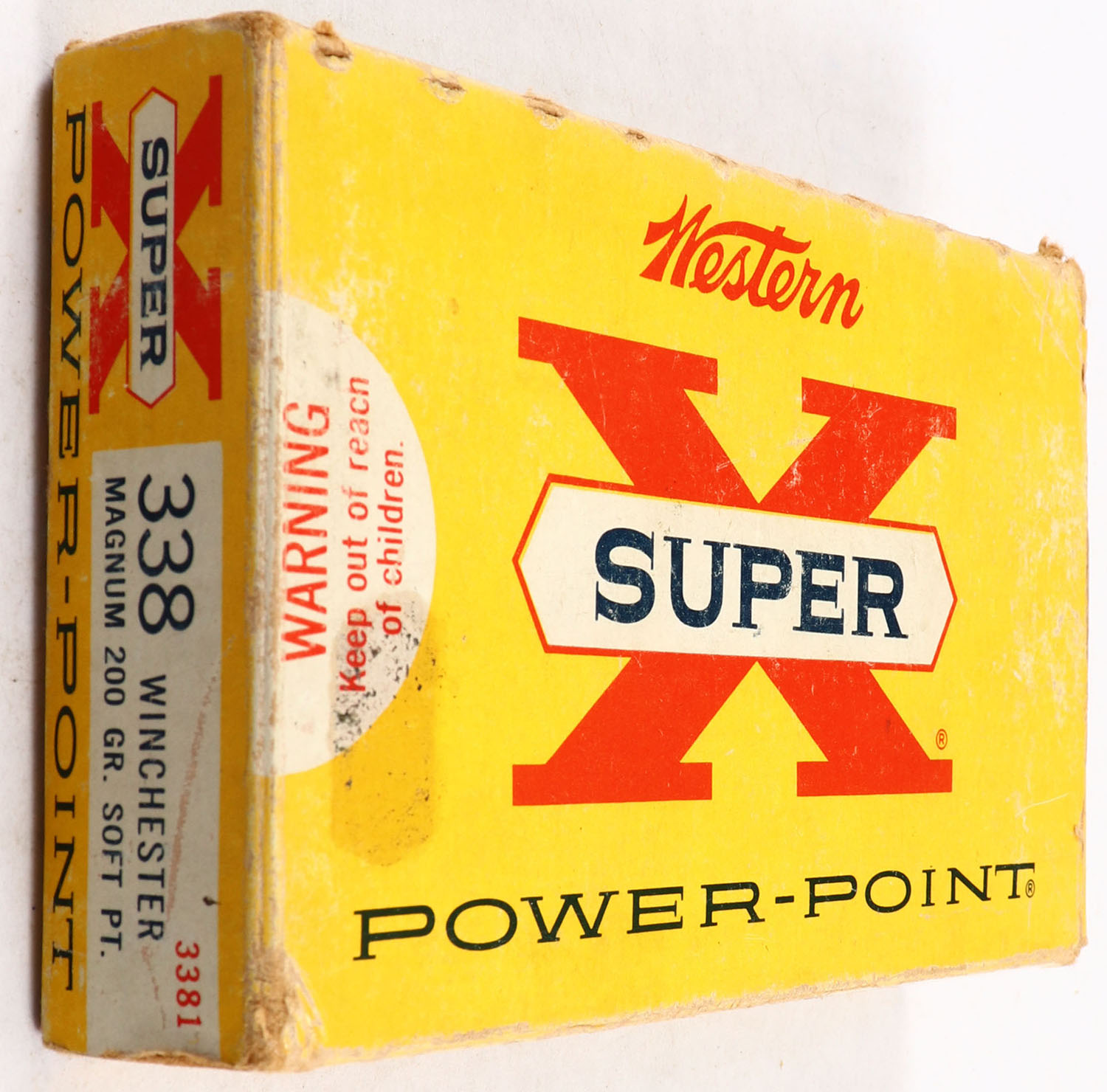 Western, Super X Power-Point, .338 Win. Magnum, 200 Gr. Soft Point, Full (15rds. Correct), 1pc. Yellow red & white box, box is solid with very good color, box has shelf wear & scuffing, corner & edgewear, end flaps are solid, ammo is excellent. Grade: Very Good + - Value: 20 to 80