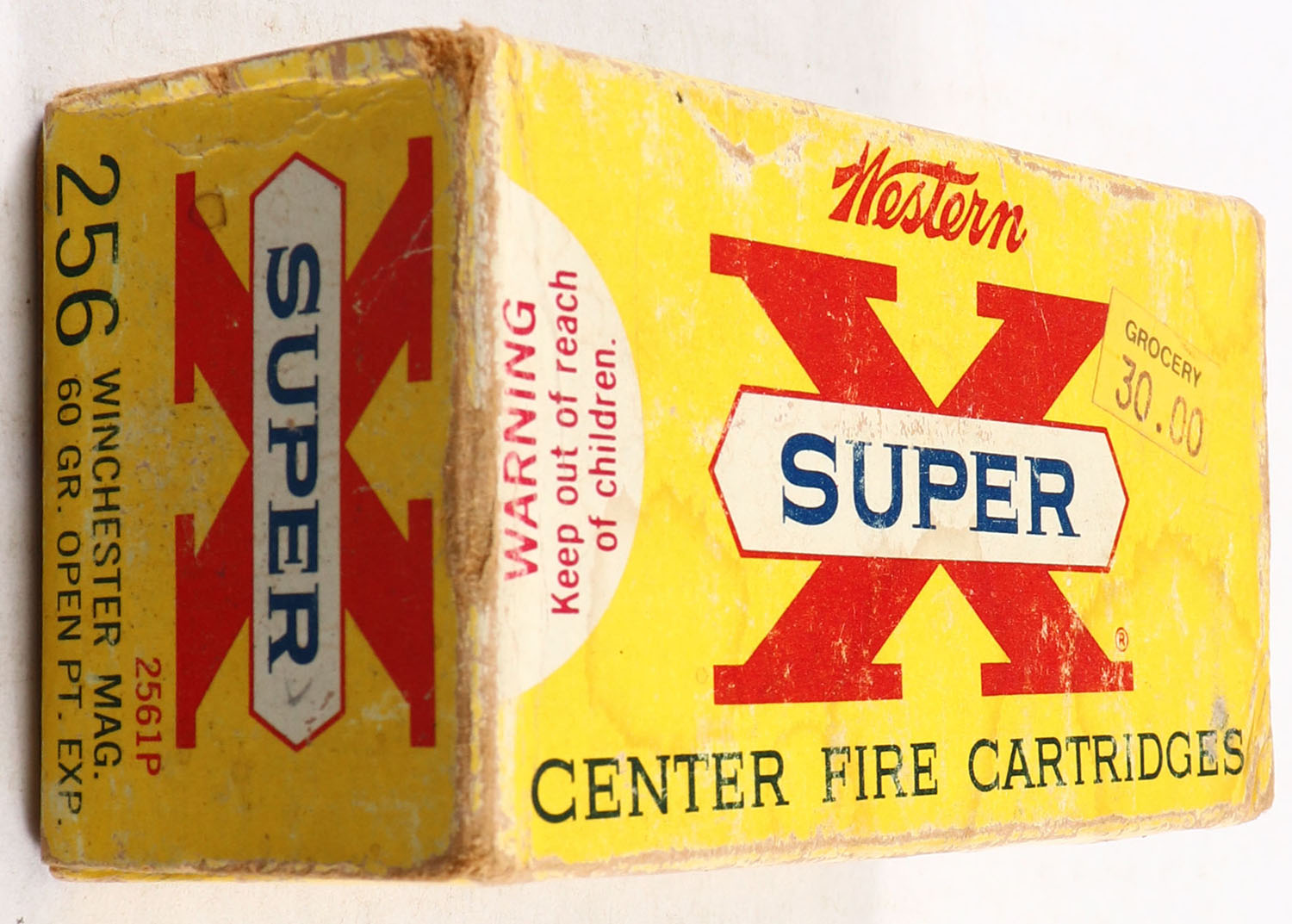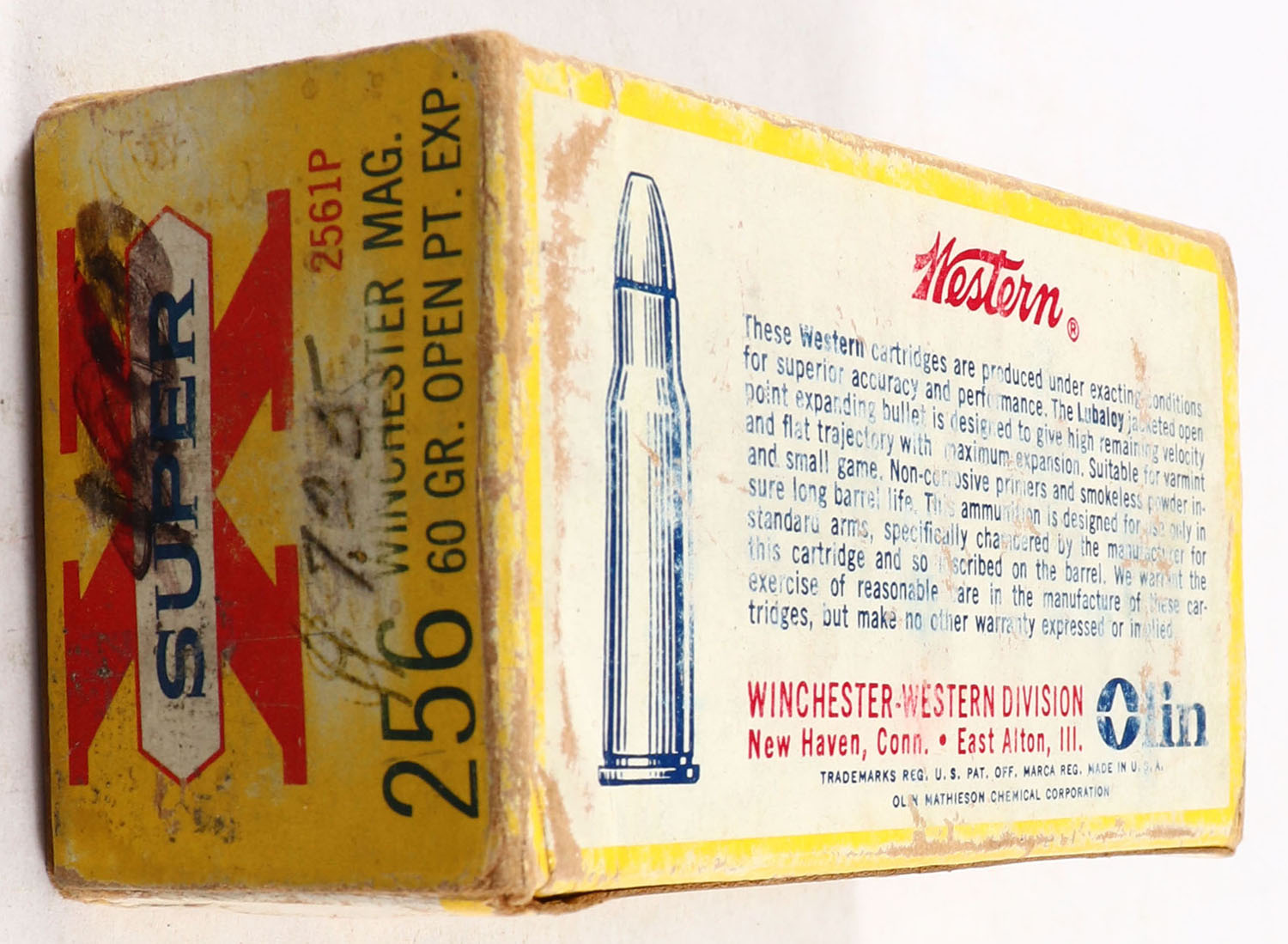 Western, Super-X, .256 Winchester Magnum, 60 Grain Open Point Expanding, Partial 44rds., 1pc. Yellow white & red box, box is solid with very good color, has age soiling with shelf wear, some corner & edge wear, end flaps are solid, ammo is excellent. Grade: Very Good + - Value: 50 to 150