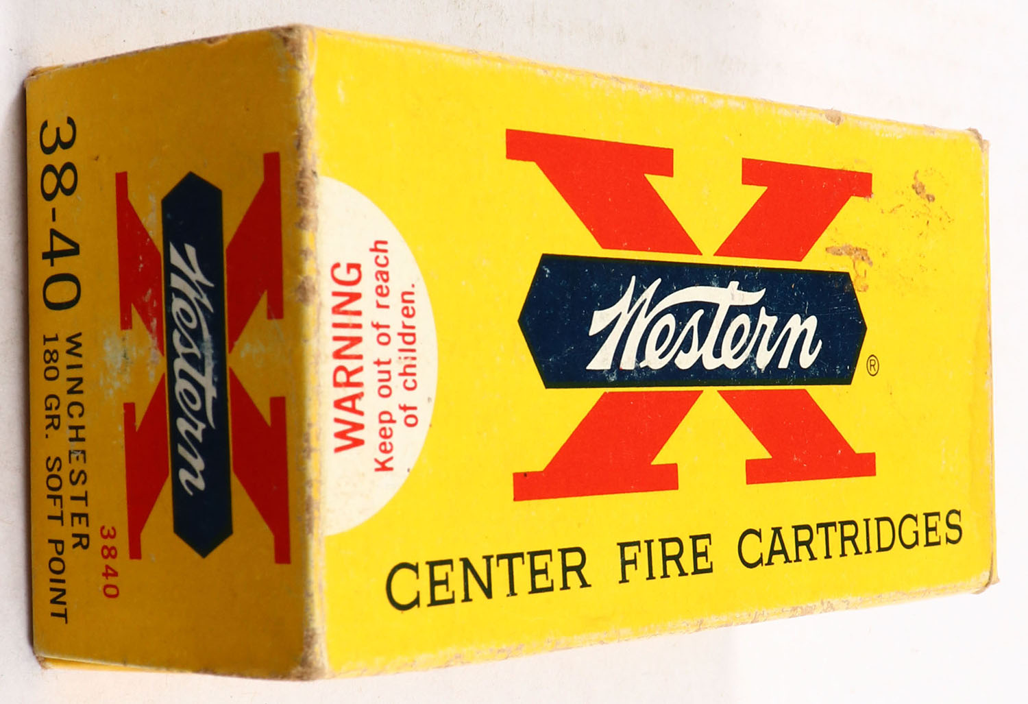 Western, X, .38-40 Winchester, 180 Grain Soft Point, Full, 1pc. Yellow white & red box, box is solid with excellent color, very minor shelf wear, minor edge & corner wear, end flaps are solid, ammo is excellent. Grade: Excellent - Value: 30 to 90