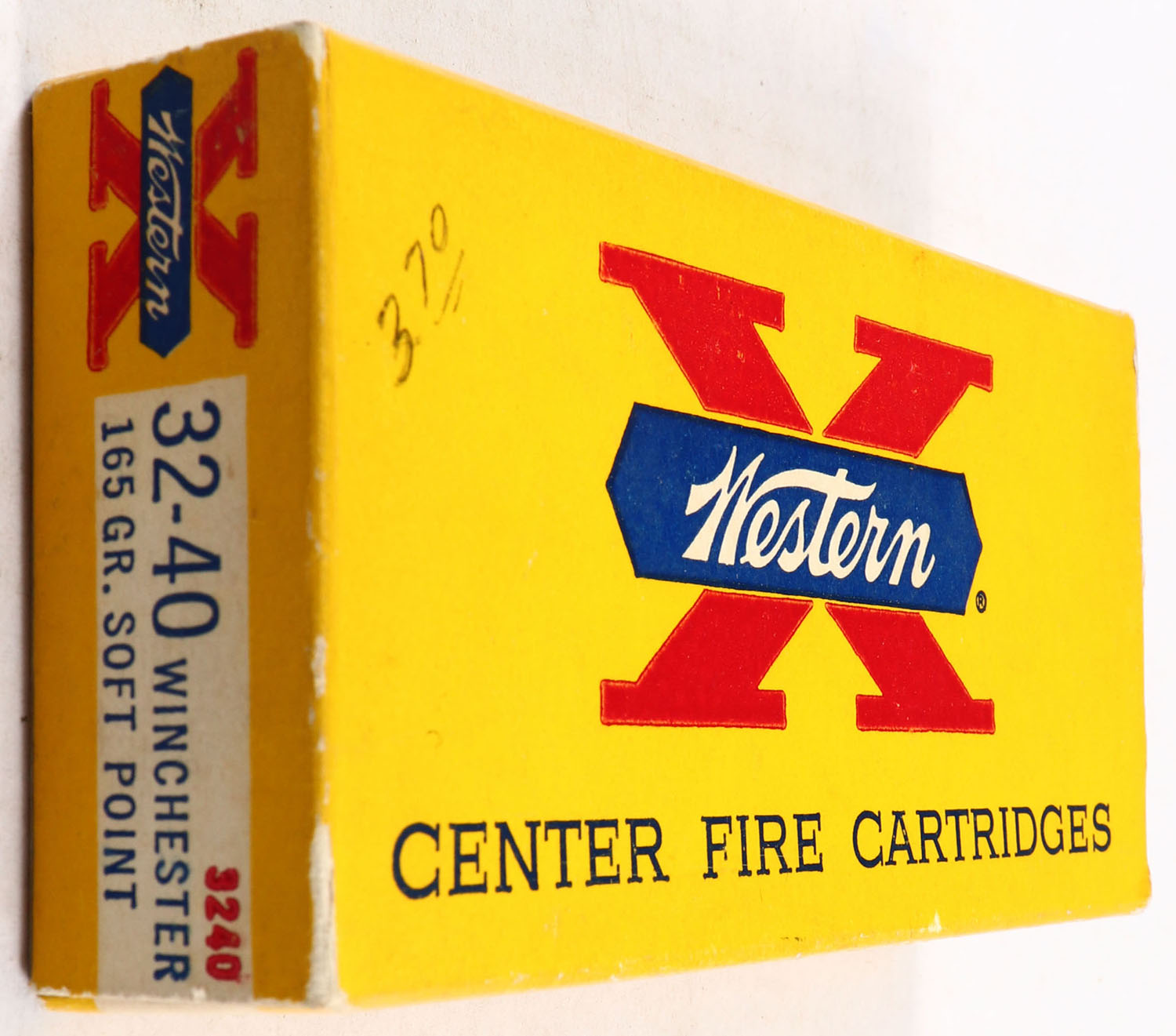 Western, X, .32-40 Winchester, 165 Grain Soft Point, Full, 1pc. Yellow white & red box, box is very solid with excellent color, very minor corner wear, edges are mostly crisp, top has been written on, end flaps are solid, ammo is excellent. Grade: Excellent + - Value: 50 to 150