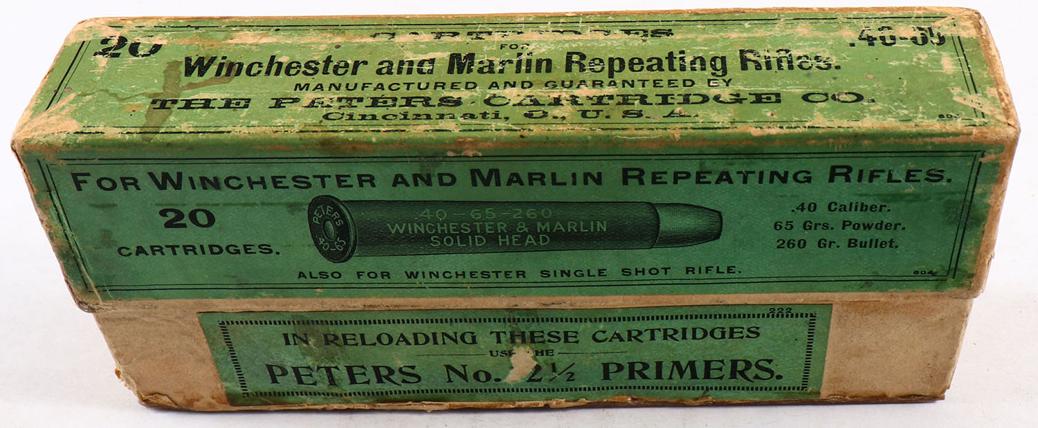 Peters, .40-65 Winchester & Marlin, 260 Gr. Solid Head, Semi-Smokeless powder, Full, 2pc. buff box with green label & black print, bottom box has been repaired, box has soiling & scuffing with edge wear, ammo is very good. Grade: Very Good - Value: 50 to 200